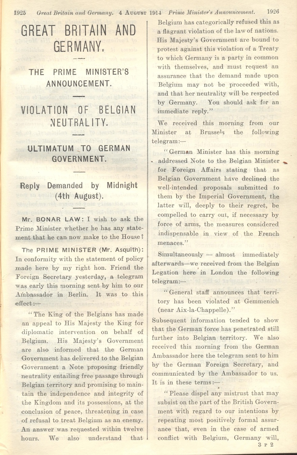 Just one day later, on the 4th of August 1914, Britain presented Germany with an ultimatum, after the latter’s violation of that Belgian neutrality. The reporting of this ultimatum to Parliament can be seen below: