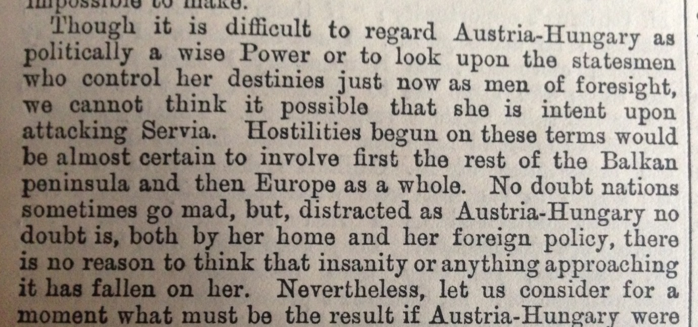 From a British perspective, our Hansard collection (Hansard being a verbatim record of everything said in the Houses of Commons and Lords) allows the reader to trace the thoughts and reactions of government to continental events on an almost daily basis. Interestingly, relatively little mention was given to those events until Austria-Hungary presented Serbia with an ultimatum on July the 23rd. Even at that stage, the hope was that the conflict need not draw in other European powers, especially Britain. The image below shows the comment made by Edward Grey, Foreign Secretary, regarding the Austrian ultimatum: