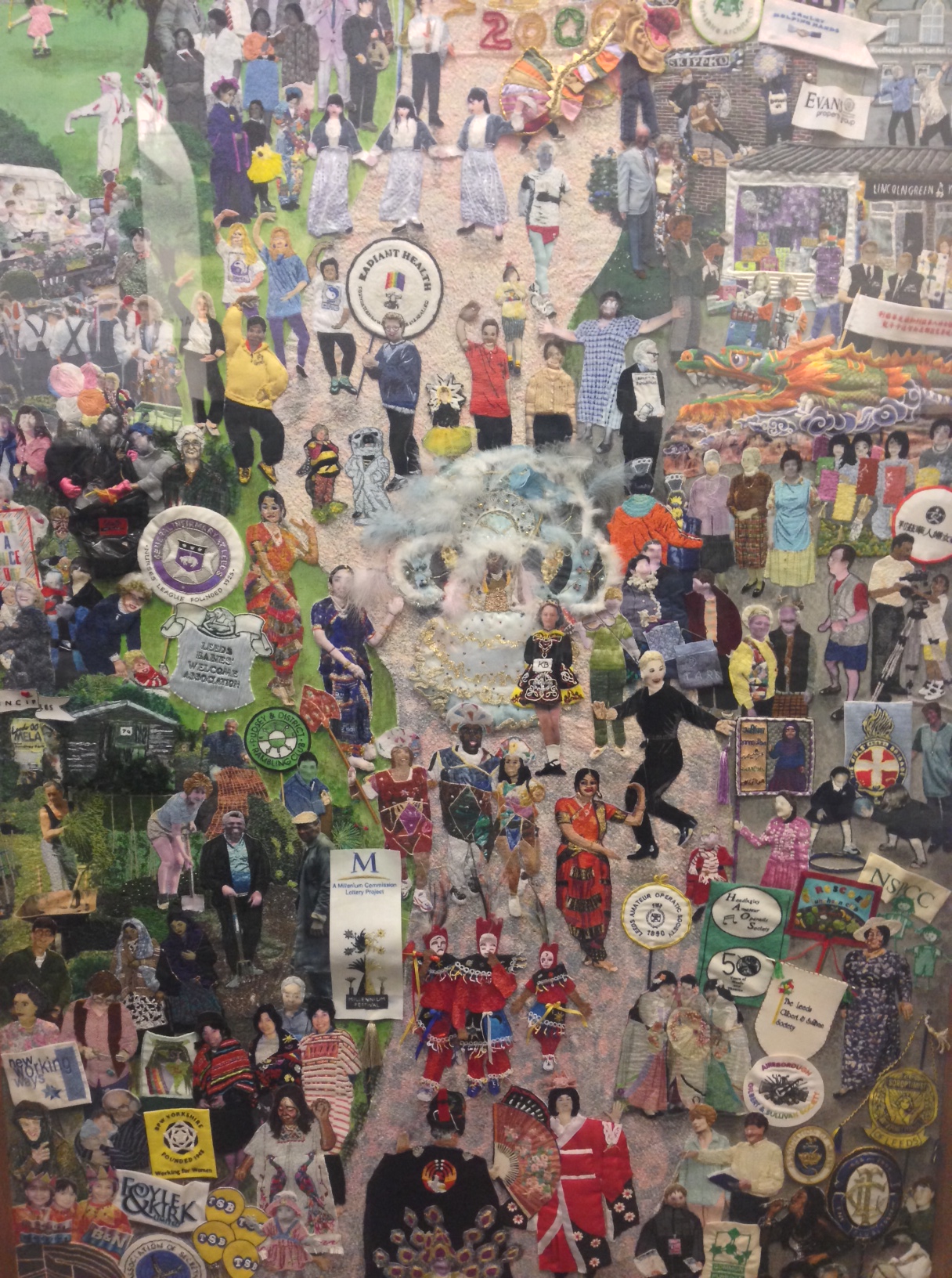 The Tapestries were created between 1992-2002 and it was a community arts project to celebrate the millennium. The project was devised by Kate Russell who is a local community artist. Her vision was to create a rich tapestry of Leeds life, involving all different sectors of the city. There are 16 panels, they measure 2.4mX1.5m and each has a separate theme including; education, health, transport, industry etc.