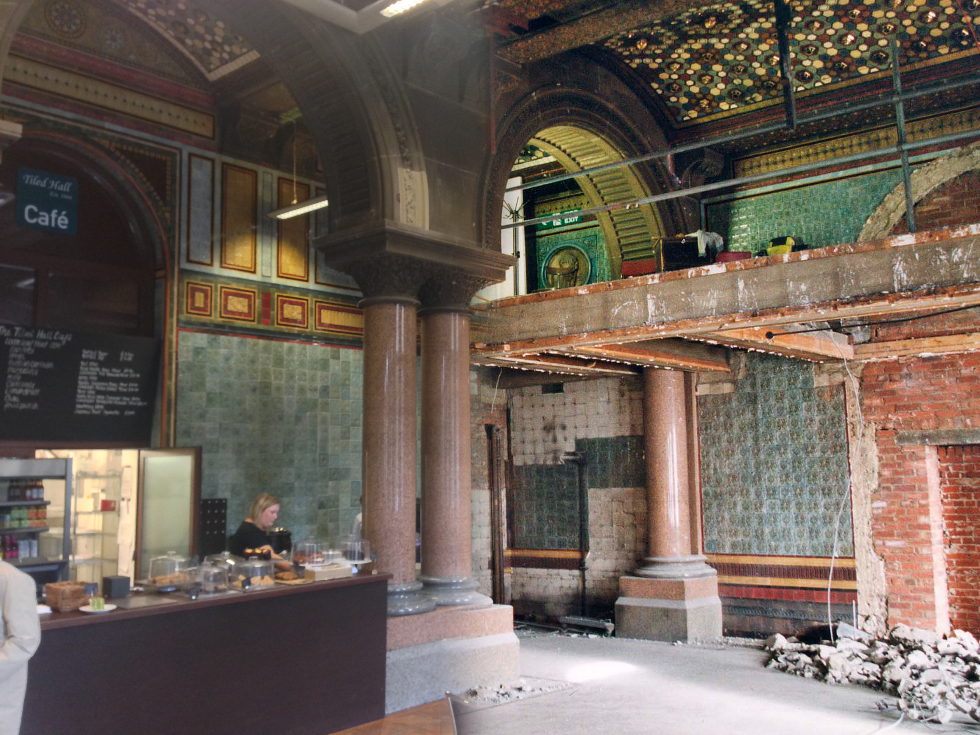 Again in the Tiled Hall this image shows the current cafe on the left with restoration work carried out before the cafe moved in.