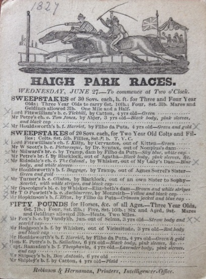 Race cards were produced for each race meet and the Local and Family History Library have a collection of these cards dating from the opening in 1824 through to 1832. In the opening year there were several different lists of runners produced that caused great confusion for the gambling public attending the races. As a ‘mark of distinction’ the official race cards had a map of the race course printed on the reverse to dissuade rogue printers and were labelled ‘Todd’s Correct Card’.