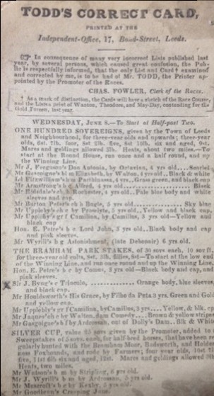 Over the years the races attracted a variety of people, both gentlemen and the lower classes. The Leeds Mercury (1 July 1826) acknowledged that the racing has been ‘pretty good’ but ‘we can testify to the enormous influx of pick-pockets, gamblers, and prostitutes; who have infested our streets during the week, diffusing moral contamination wherever they approach.’ It asked the noblemen and gentlemen of the area to reflect seriously before sending horses to race in Leeds next year’s meeting.