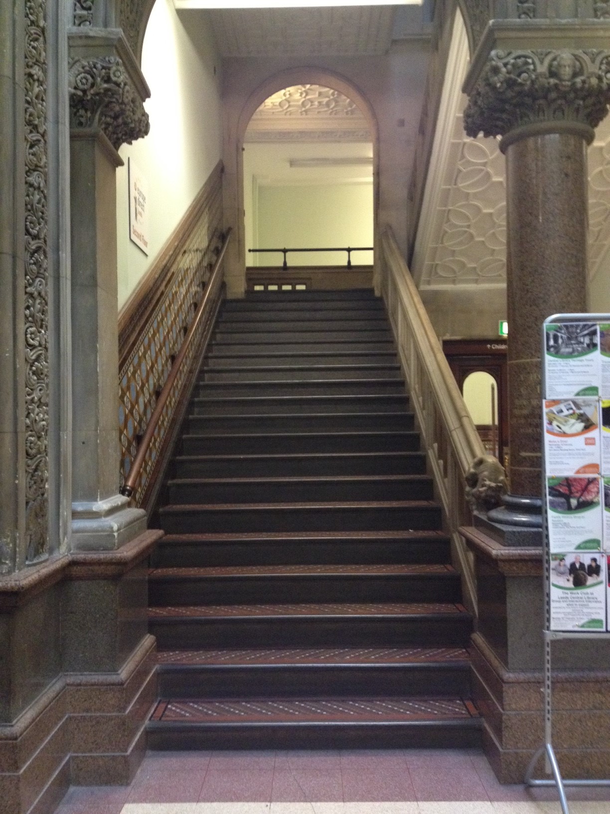 The library has two large public staircases, reflecting the original design of the building as multi-purpose municipal offices. As a long-ago visitor to what was essentially the Victorian One-Stop Centre, you would’ve entered from Calverley Street and probably continued straight ahead to pay your utility bills in the room that’s now the main lending library. That means the staircase to your left is essentially the main staircase. However, we’re going to take the other set of steps – the one that begins in the area near the lift and Tiled Hall Cafe, and which would have originally led up to the lending and reference libraries, and served visitors using the Headrow entrance.