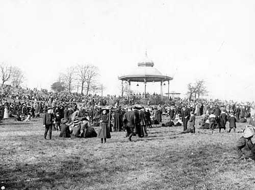 Our next picture takes us to Roundhay Park in the early 1900s, where crowds have gathered around the bandstand to listen to live music. Two clues in the image suggest this was most likely taken at Easter time: firstly, the lack of leaves on the trees in the background and, secondly and perhaps more tellingly, the fact that everyone is dressed in their best clothes.