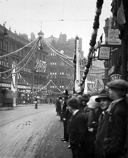 We’ll leave you with a view of the building from 1928, taken from our Leodis website. September of that year saw the city’s ‘Civic Week’, a celebration of local spirit and pride, so you’ll notice bunting, streamers and a large crown – as well as the Griffin and its clock in the background. Also visible is a well-known chemist that still has branches all over the city today. Check back for future midweek mini-posts as we view more unexpected perspectives of Leeds over the coming weeks.