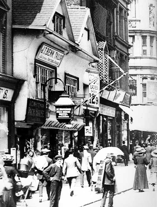 Our photograph reflects a window of opportunity on a less busy weekday (and, yes, there’s plenty of reflecting visible on the window in the image – sorry). As well as appreciating the surprising slope of the street from this angle, you’ll find it’s the often ornate upper levels of the surrounding buildings that stand out, rather than the shops beneath. Take a look at the next photo, from 1909, and see if you can work out which buildings it shows.