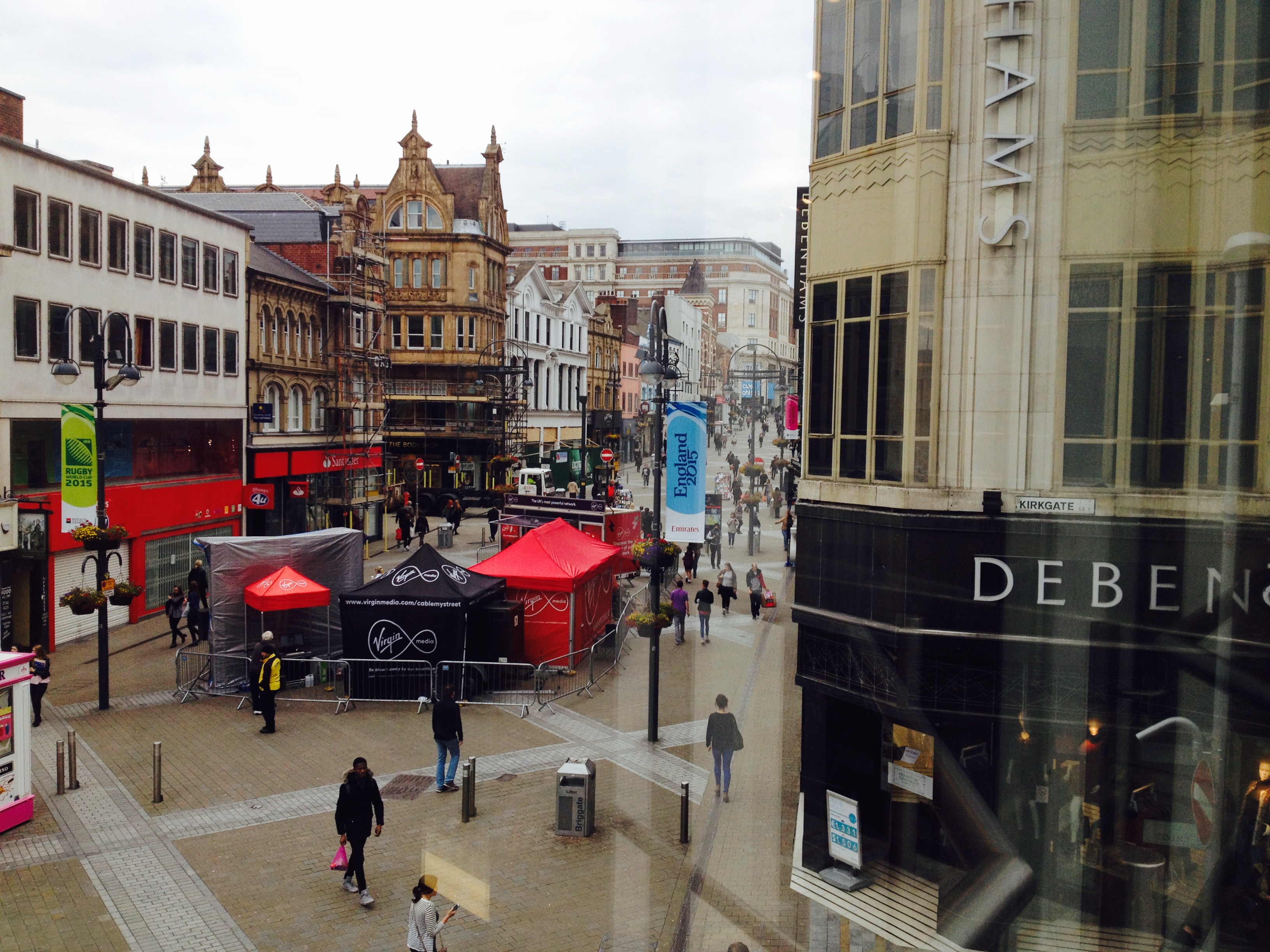We’re back causing trouble in city centre shops again this week, squeezing ourselves around an upstairs window display to get an elevated view of one of Leeds’s busiest retail routes, Briggate.