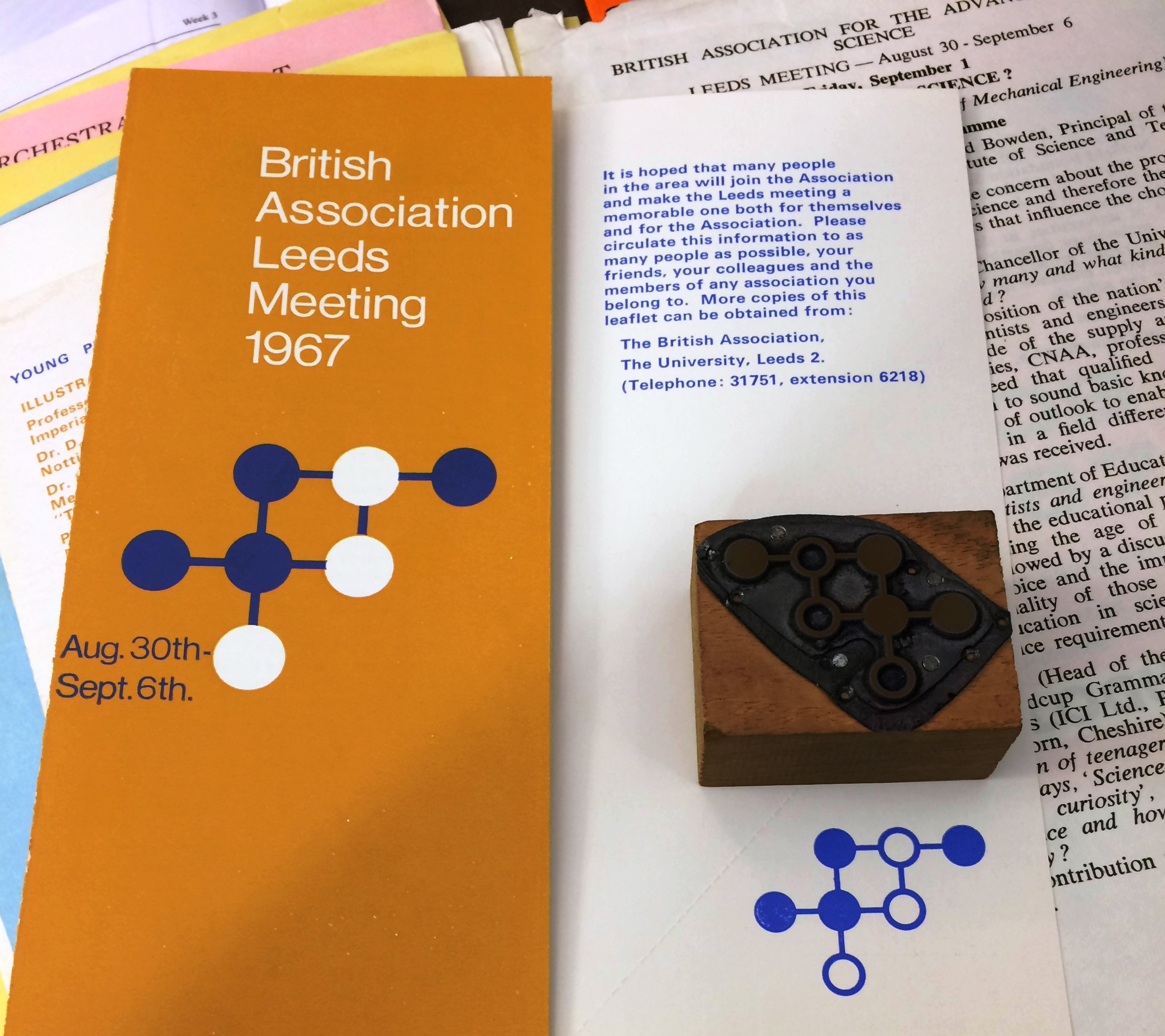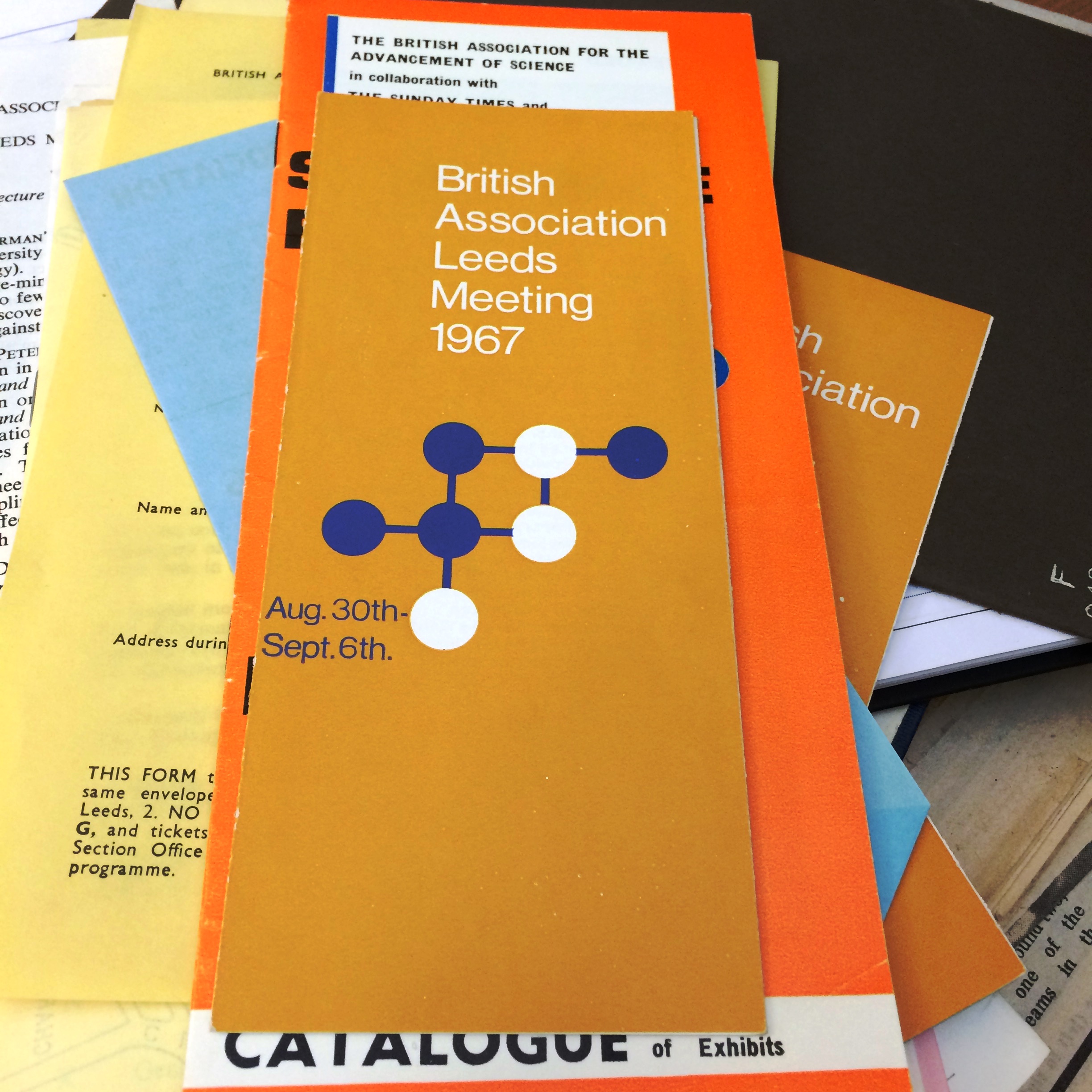 Instead of (or, rather, as well as) finding that Yates’ material, we stumbled across an intriguing envelope entitled “British Association for the Advancement of Science [Leeds] 129th Annual Meeting”. Hmmm, we thought – could that British Association be the same “British Ass. Meeting” on the spine of our singular item? Looking closer at the envelope contents, among a myriad of information about the Association’s 1967 meeting in Leeds, we found something very interesting indeed: