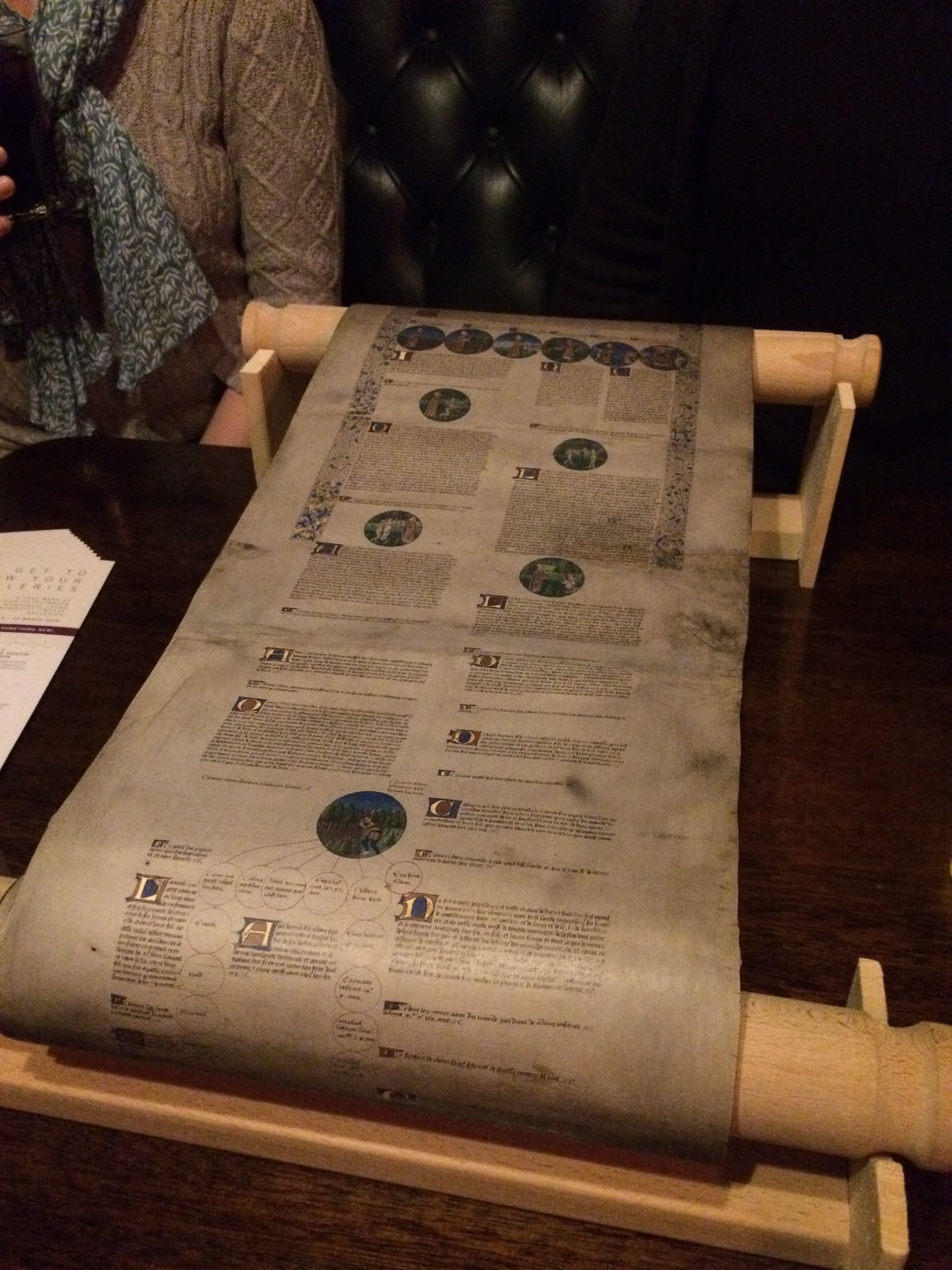Laura and Rhiannon joined us from the Brotherton Library with an absolutely amazing treasure from their collections: a facsimile of the Genealogical History Roll that is on display in the Treasures of the Brotherton Gallery at the University of Leeds. Laura says of this wonderful piece: “The real item was made in Paris between 1461 and 1483. This manuscript chronicle, written in Anglo-Norman French, uses illustrations and family trees to describe the history of the world. It begins with the Biblical creation story and ends with the history of Louis XI, King of France. It is almost 18 metres long and made of 39 large pieces of parchment pasted together.”