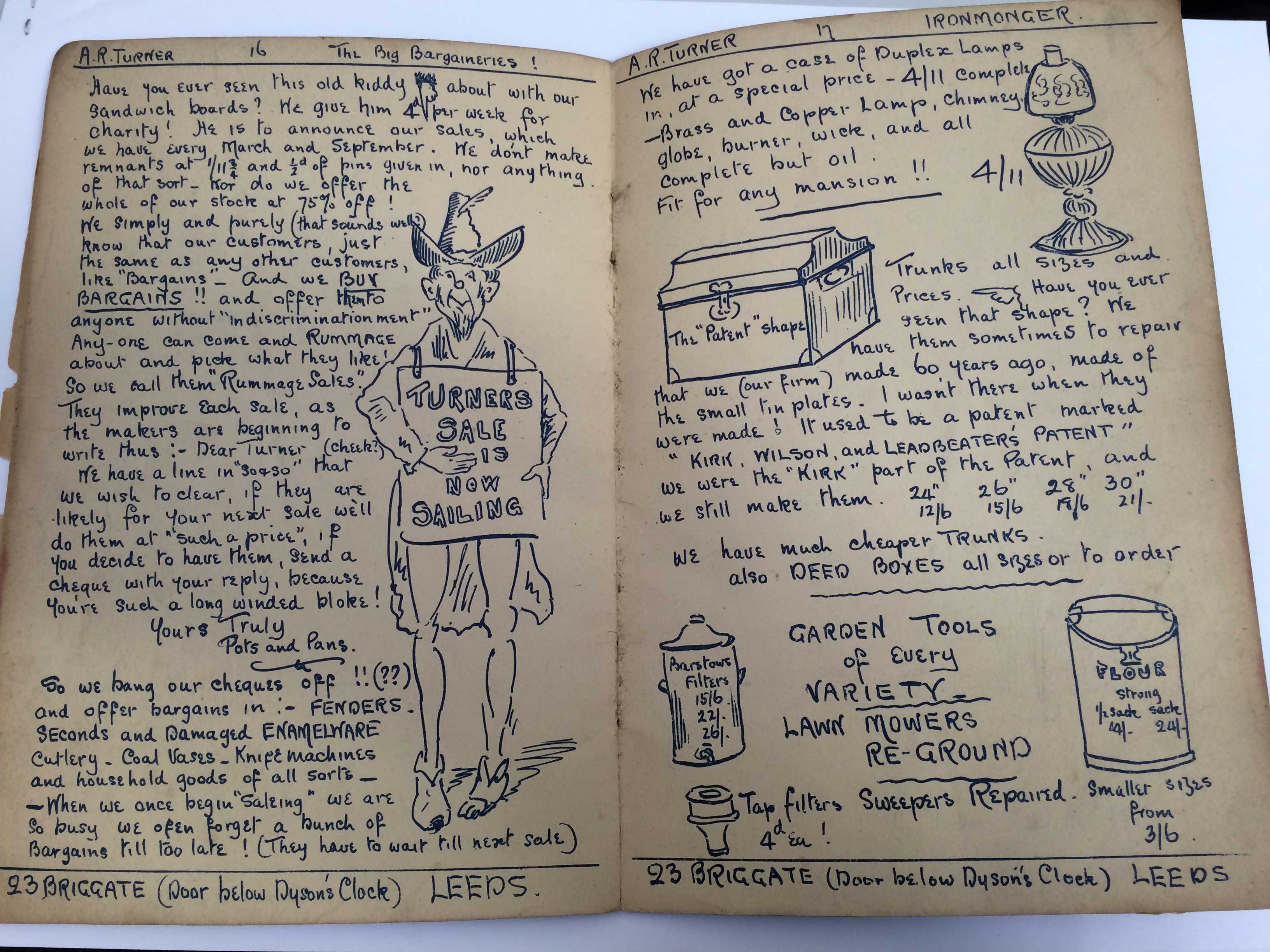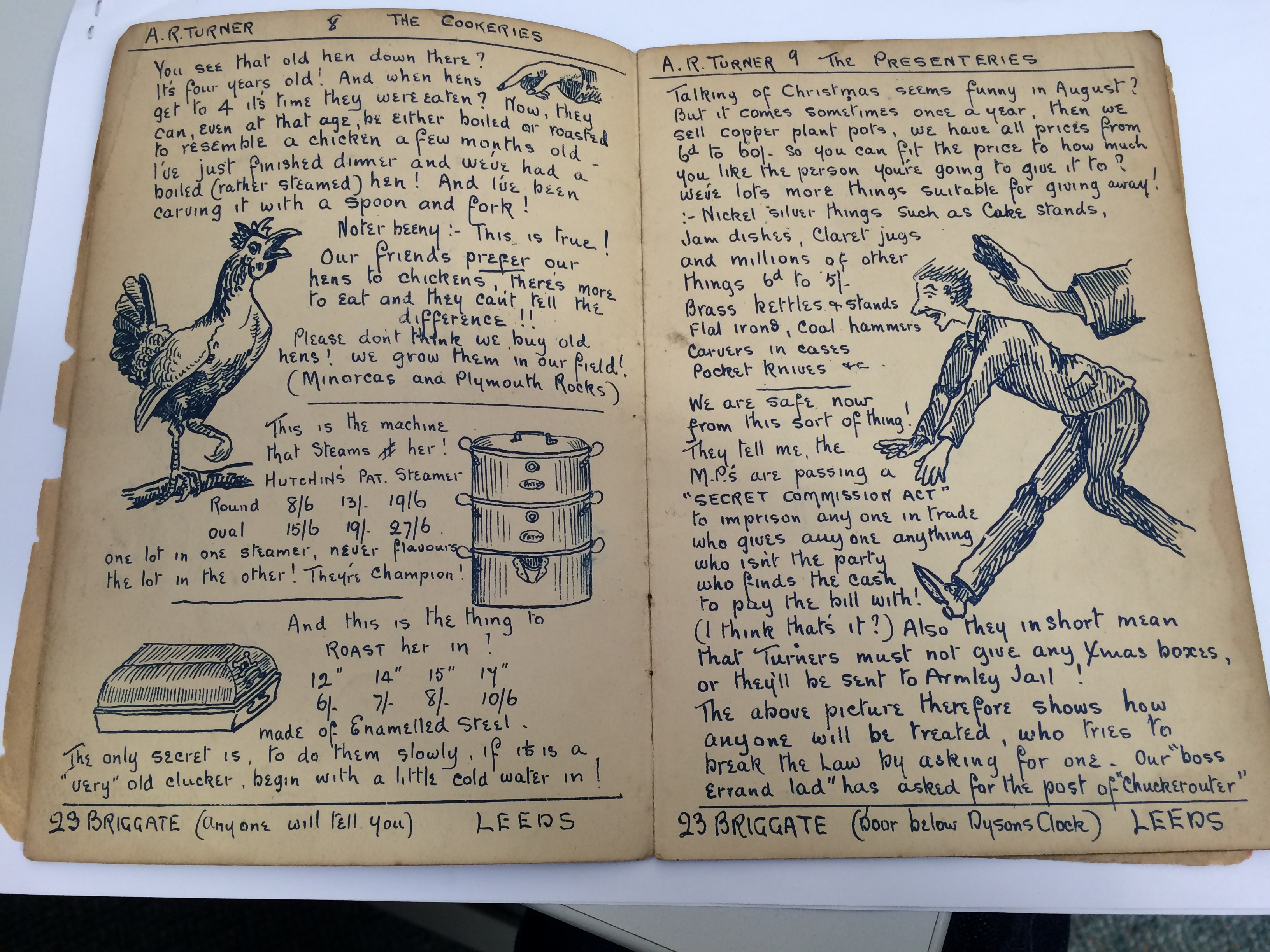 But Turner’s catalogues give us a glimpse into that unrecoverable past and brings it crashing through to the present. As we browse his writings, we can feel his voice, his flesh and blood self, living again alongside our own; for a few minutes at least, the veil of history is lifted and we walk the streets of 1900s Leeds with Arthur Rigby Turner.