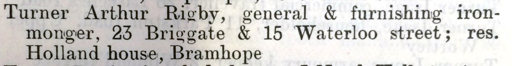 Who was A.R. Turner? Only a few lines are needed to show what we know about the man and his business. Based at 23 Briggate, the store is listed in contemporaneous trade directories, while Turner and his family can be found in the various census of the time. Turner’s first name was Arthur, his middle-name Rigby and he was born in 1863, making him around 40-years old at the time his store catalogues were published.