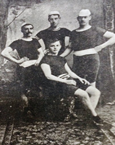 Potternewton Cycling Club winning team: F. Wadsworth, J. Stanton, W. Maude, W. Hall (seated), Harehills Cycling Tournament, 6 September 1890
