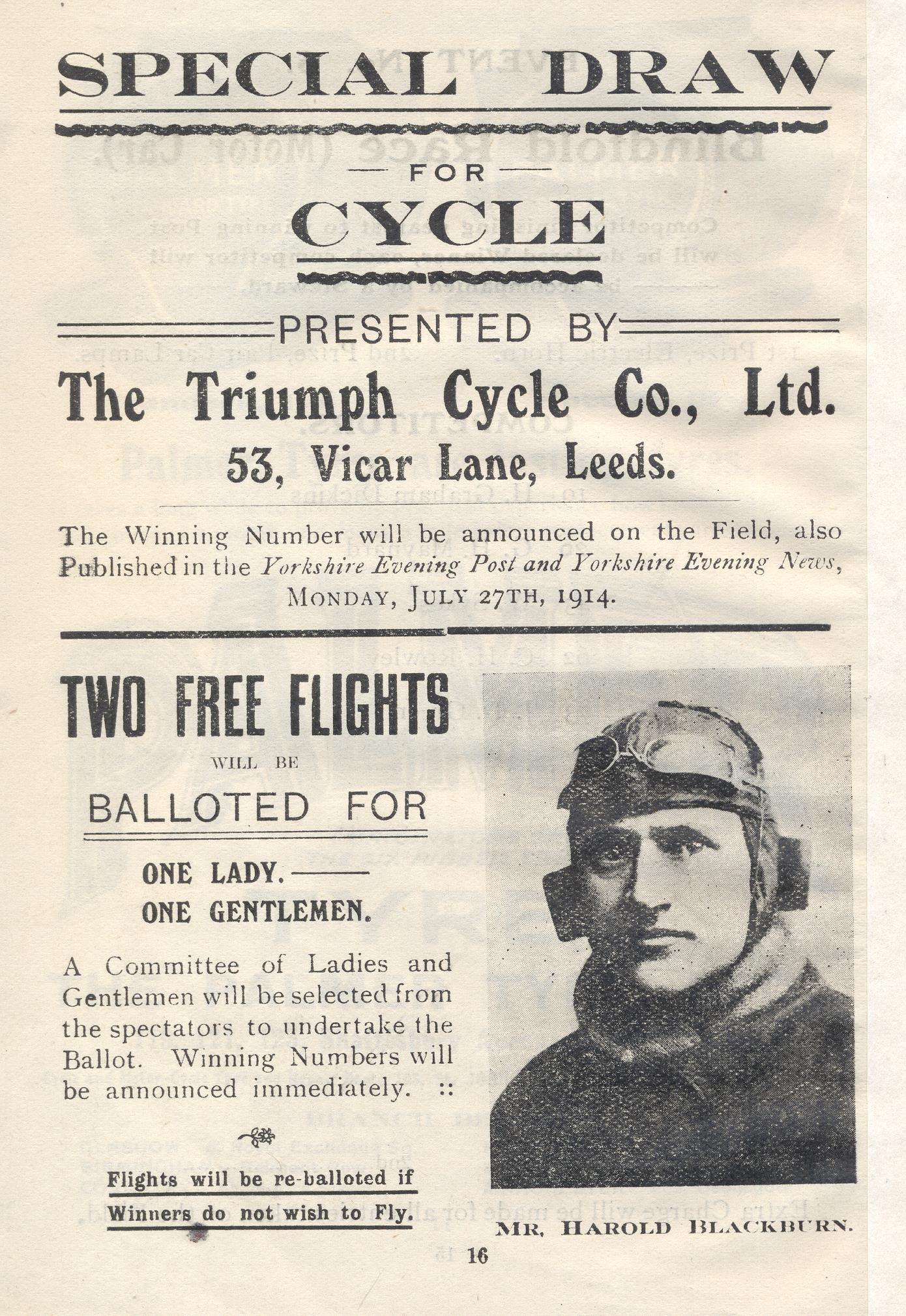 We know Blackburn was in Roundhay Park ten days before because he was offering free flights for the two lucky winners of a ballot at the Fancy Dress Parade and Gymkhana held on Soldiers’ Field on Saturday 25 July 1914. (Our image comes from the event programme produced by the Leeds Cycle and Motor Cycle Charity, at shelf mark: LP 796.4 L571).