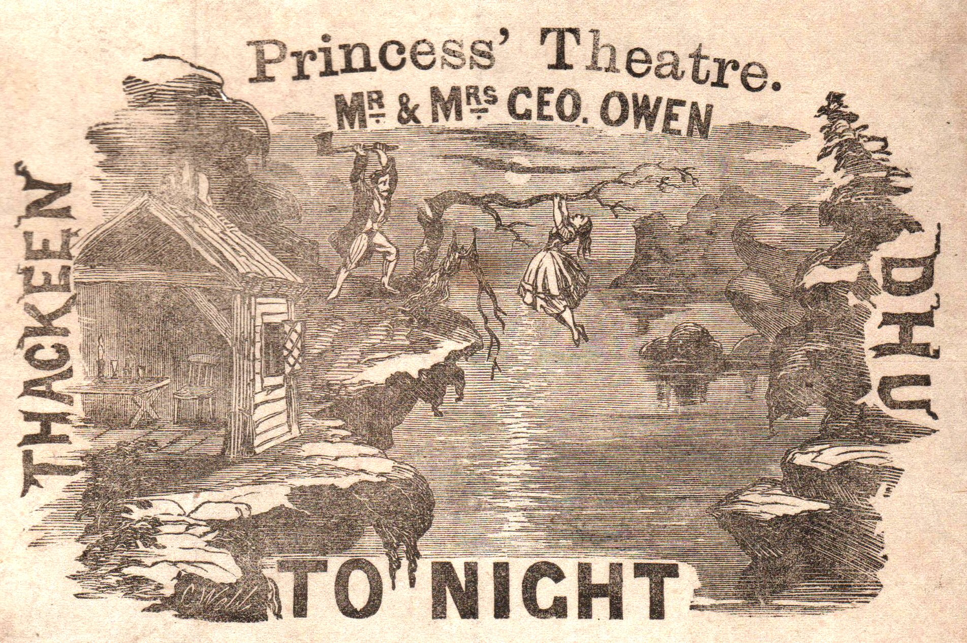 The playbill features an illustration of Norah, the Thackeen Dhu, holding onto the branch of a tree while she hangs over over a ravine trying to escape from Barney the Sot, who is trying shown chopping on the branch of the tree she is holding onto with an axe; these characters played by Mrs. George Owen and Mr. George Owen respectively.