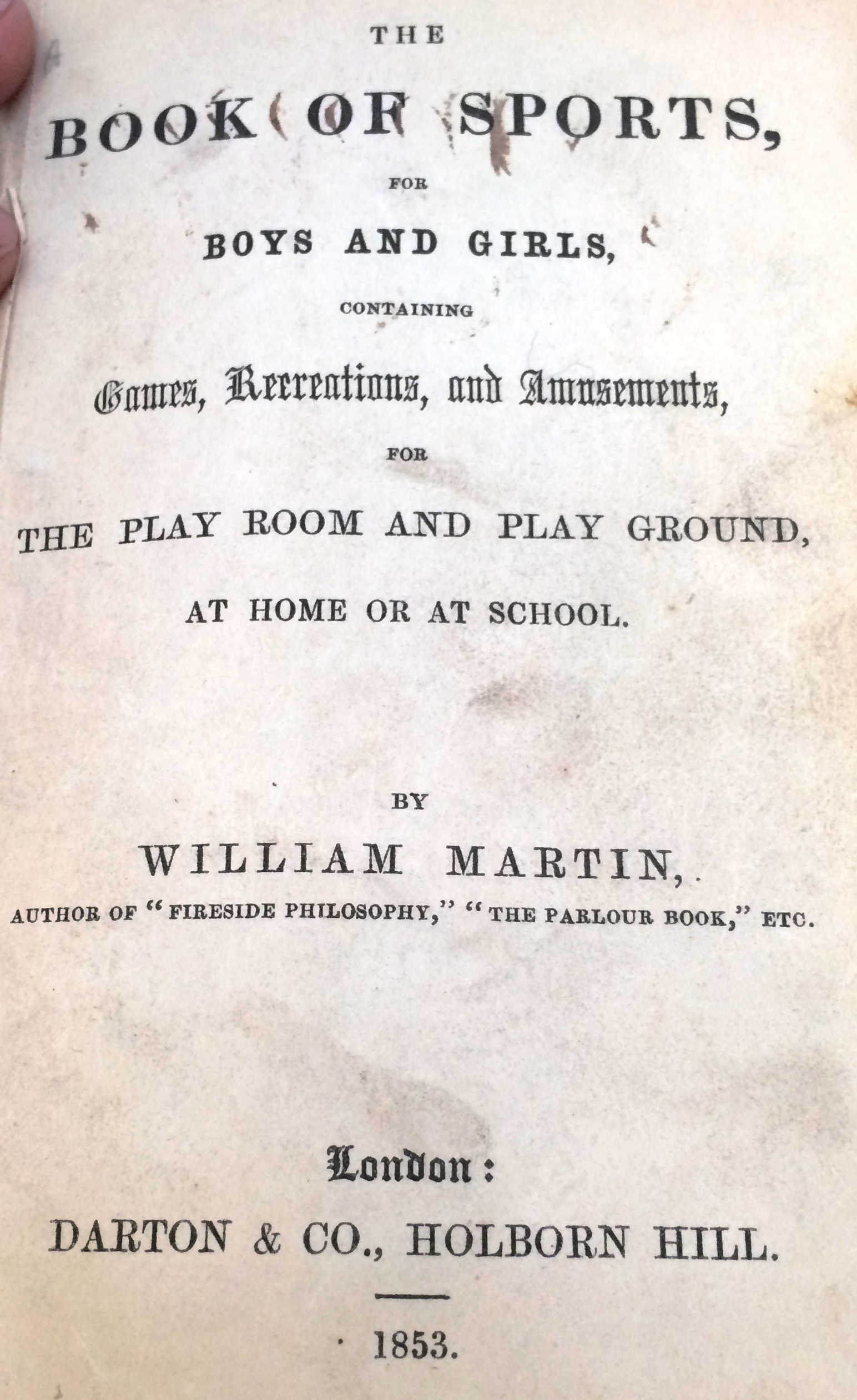 The Book of Sports for Boys and Girls; Containing Games, Recreations and Amusements, for the Play Room and Play Ground at Home or At School was written by William Martin – author of “Fireside Philosophy” and “The Parlour Book”, among other titles. Our copy was published in 1853 and is presumably a first-edition, as no information about reprints can be found. In fact, little information about the book or the author can be found – all that we have are the book’s contents.