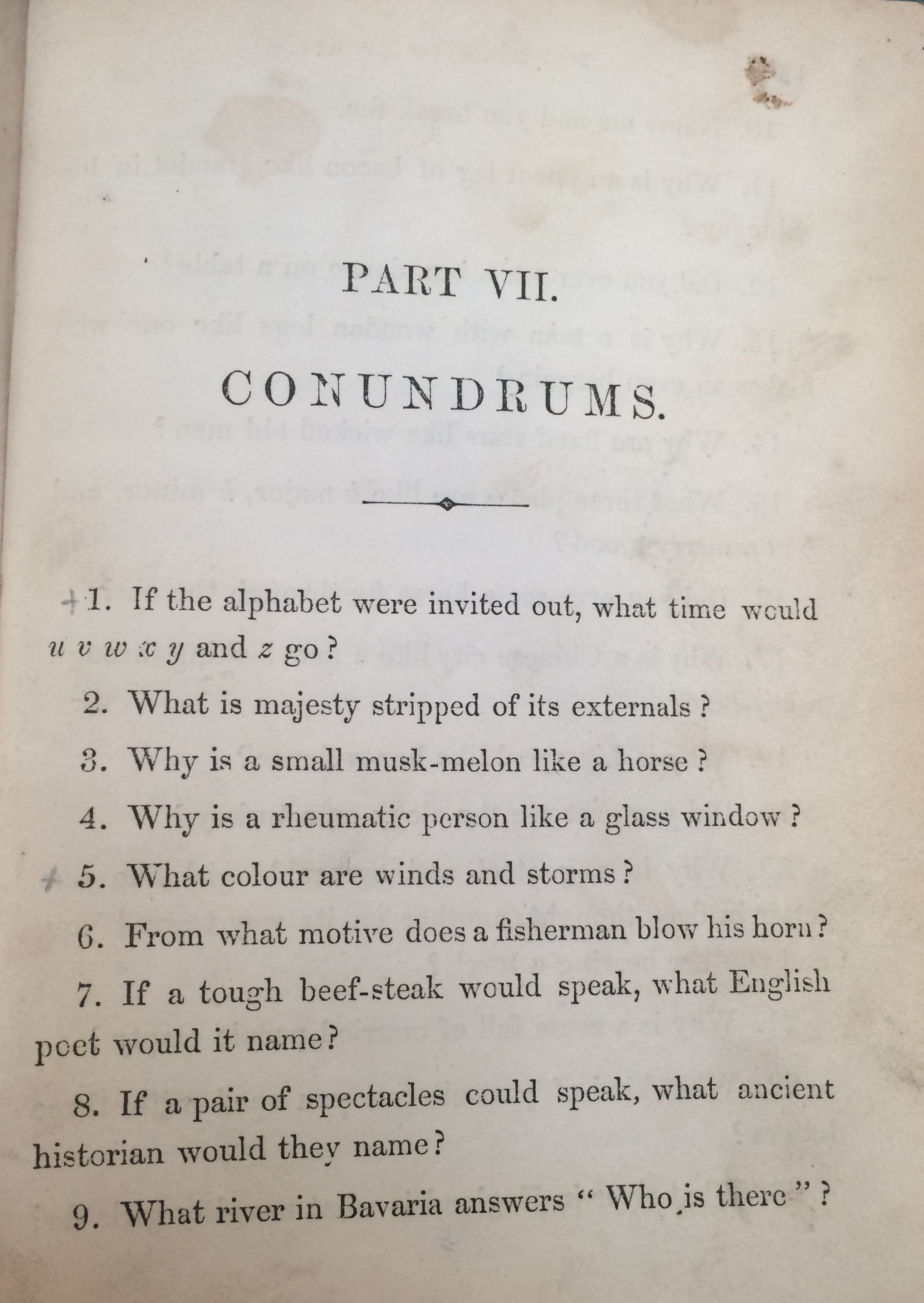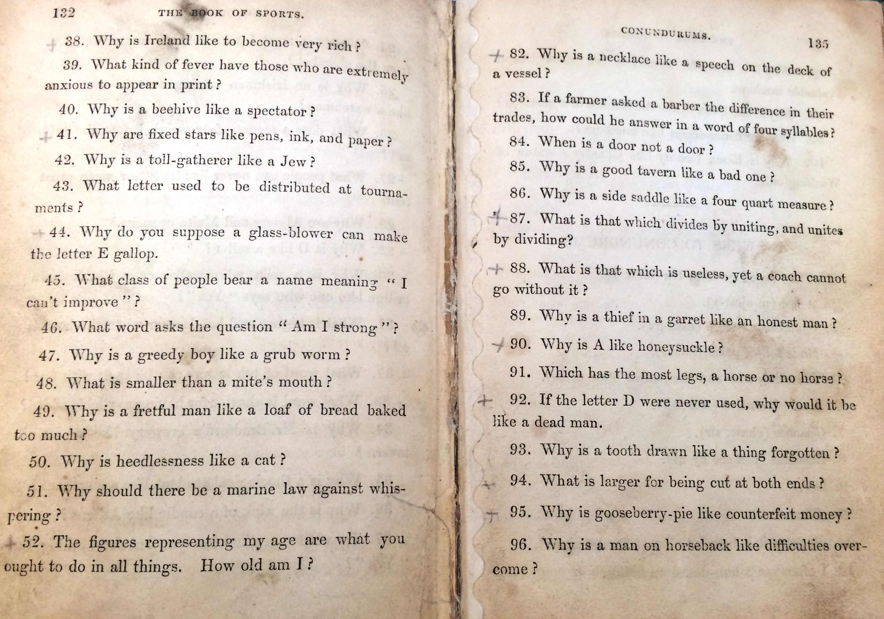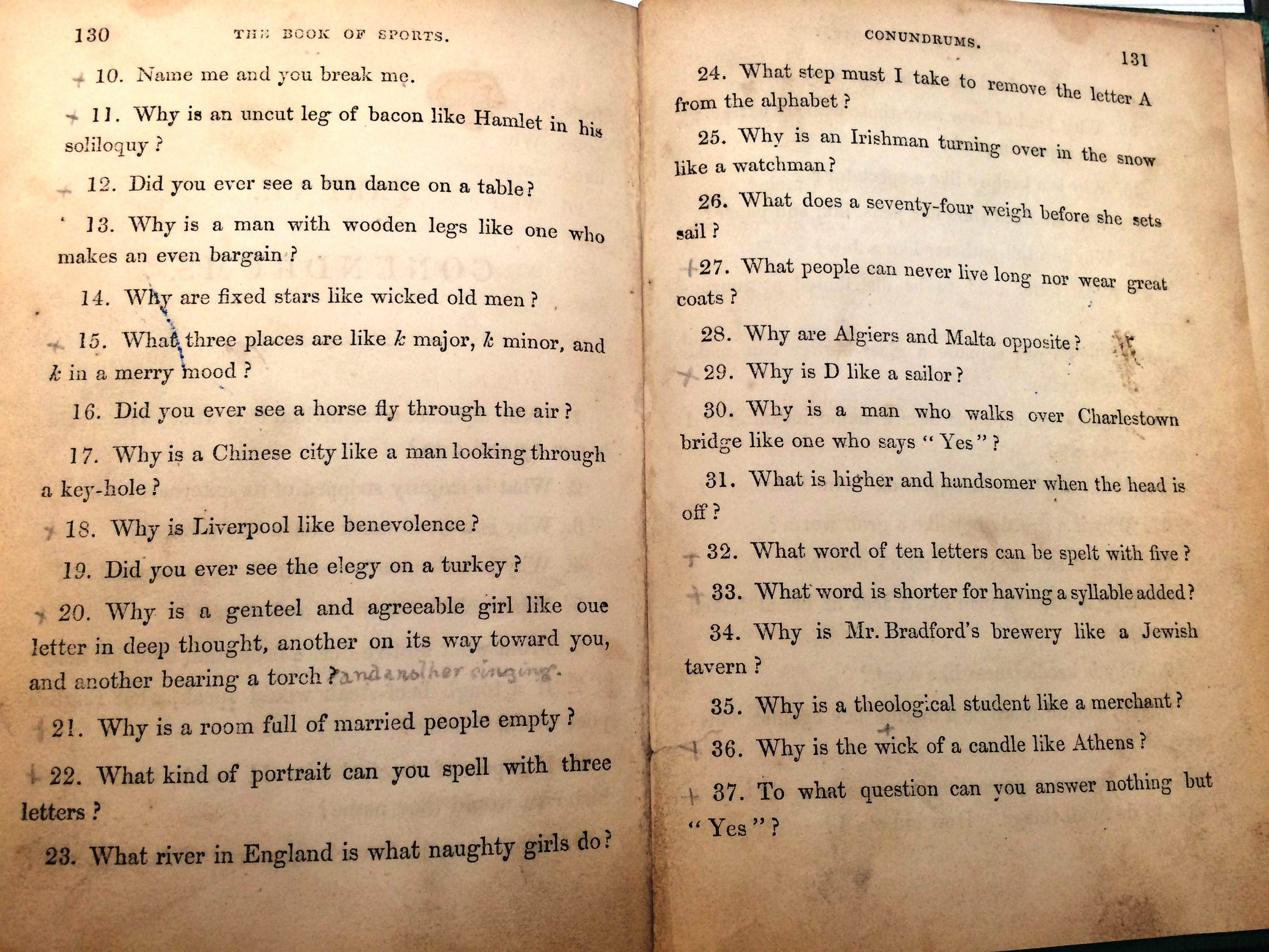 Why not give them a try for yourself? (sadly the pages containing Conundrums 53 through 81 are now lost). To find the answers…visit our Local and Family History department and ask to see William Martin’s Book of Sports for Boys and Girls.