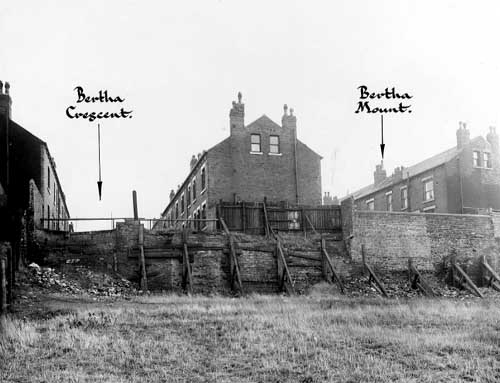 I don’t know about you, but I’m there now, in the middle of the Berthas, with bespectacled Letitia and the trigger-happy Father Morgan. I can almost smell the smoked pigeon. The Berthas, as you might have guessed, were streets – Bertha Crescent and Mount, to be exact – out on the east of the city centre, loomed over by the Catholic church described in the last story, Mount St Mary’s, which, unlike the houses, still stands today, albeit in a state of disrepair. (If Wikipedia is to be believed, it was built over the entrance to a 17th-century mine shaft… but that’s another story.) We have a picture of the neighbourhood on Leodis, from 1947, that’s even handily labelled: