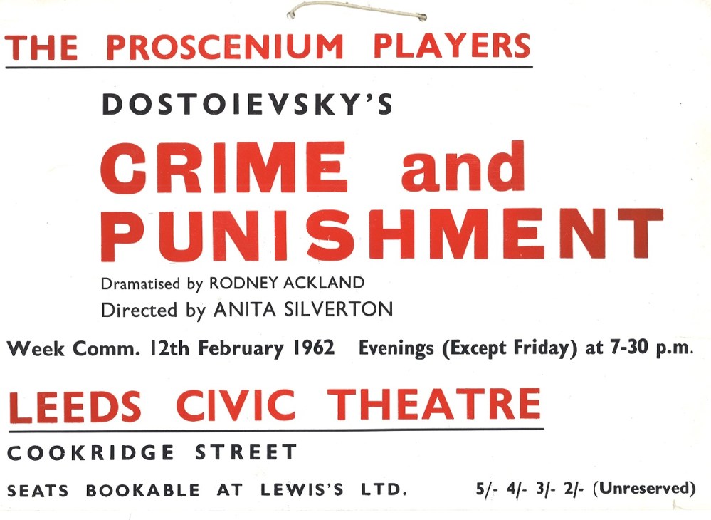 The Proscenium Players’ 1962 production of Crime and Punishment cast a young Ronald Pickup (then a student at Leeds University) in the central role of Raskolnikoff, the murderer. The young actor was universally acclaimed by the local press and went on to a very successful career on stage and screen. He recently appeared with Judi Dench and Bill Nighy as one of the main characters in the film The Best Exotic Marigold Hotel and its sequel.