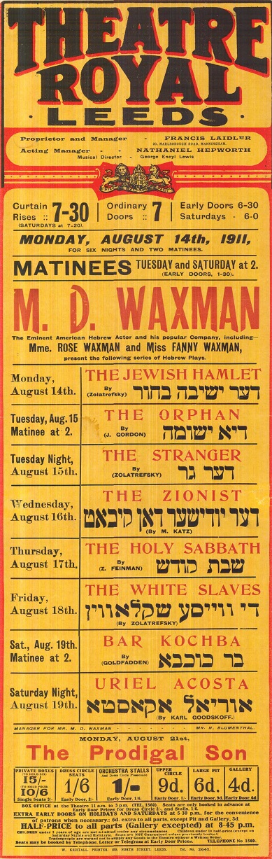 Professional productions of Jewish theatre in Leeds go back to at least 1911, with the mounting of what would become known as Yiddish Repertoire Week. Its main star Fanny Waxman (1878-1958) was a well-known Jewish actress, who was active on the London stage for forty years until her retirement in 1930. The demanding programme involved a different play every night at 8pm, and our playbills collection includes examples from 1911 and 1916, some of which are written entirely in Yiddish.