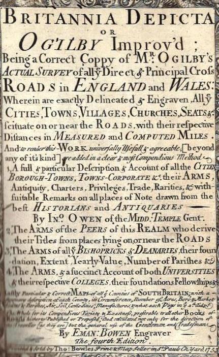 - Britannia Depicta; or Ogilby Improve’d [….]. This is a survey of all the direct and principal crossroads in England & Wales at that time. It was engraved by Eman Bowen in 1753. Shelf mark: SR 912.42 OGI