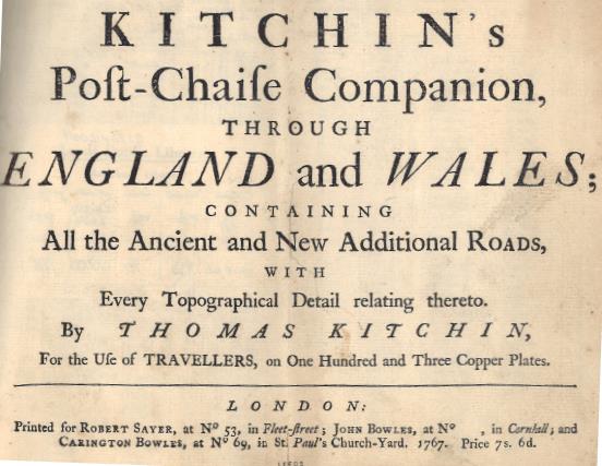 - Kitchen’s Post-chaise Companion through England and Wales; […..]. This Atlas claimed to ‘contain all the ancient and new additional roads, with every topographical detail relating thereto’. It was printed by Thomas Kitchin in 1767. A ‘post-chaise’ was a horse–drawn carriage used for transporting passengers or mail.