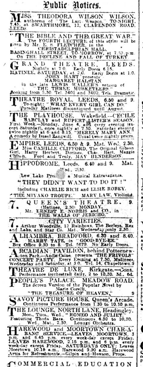 But, rather than retelling any further the story of that gathering, this blog shall focus on the slightly wider – and yet also narrower – picture: a snapshot of Leeds on that same weekend, one-hundred years ago, derived from newspaper articles and advertisements. Readers interested in finding out more about the Convention itself are directed toward a recent book.