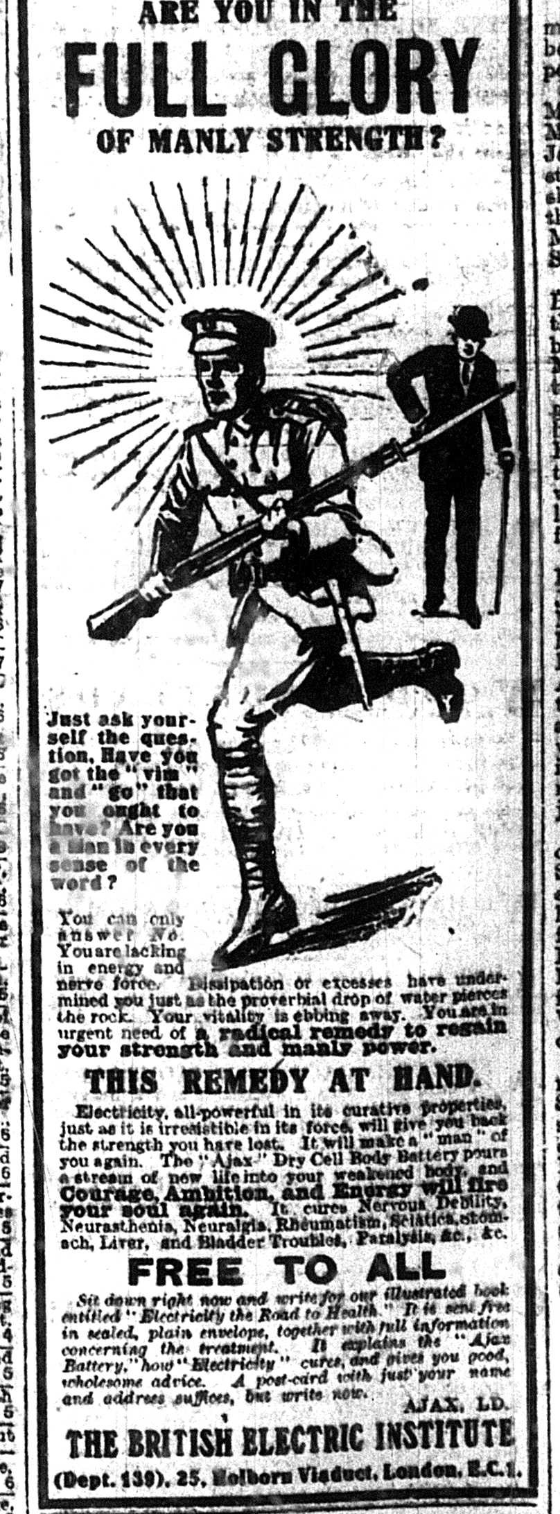 This is made even clearer in this advert, which frames the War in the context of “strength and manly power”: “Courage, Ambition, and Energy”; in the process making assumptions about what ‘masculinity’ should mean, just as the earlier pieces made assumptions about the preferred ways of living for women (shopping, keeping a good home):