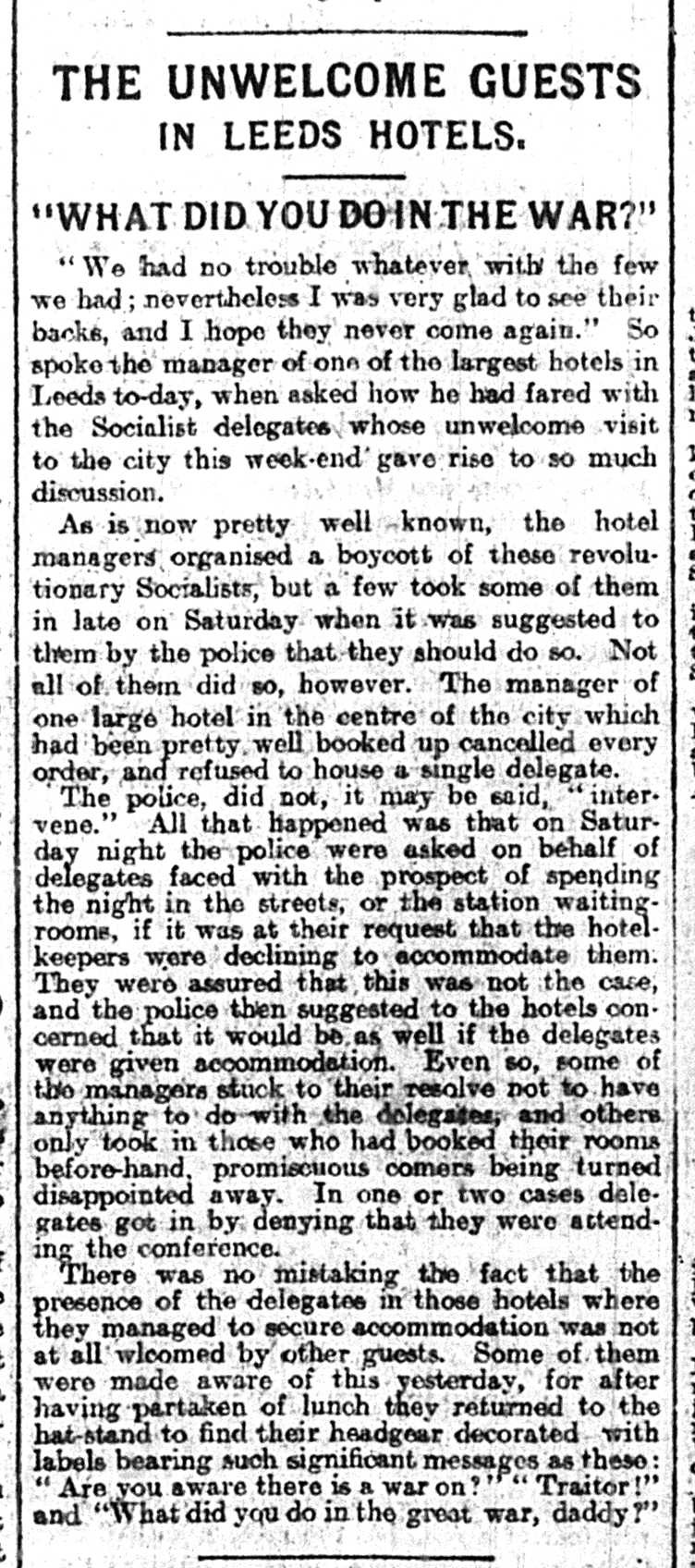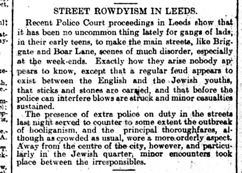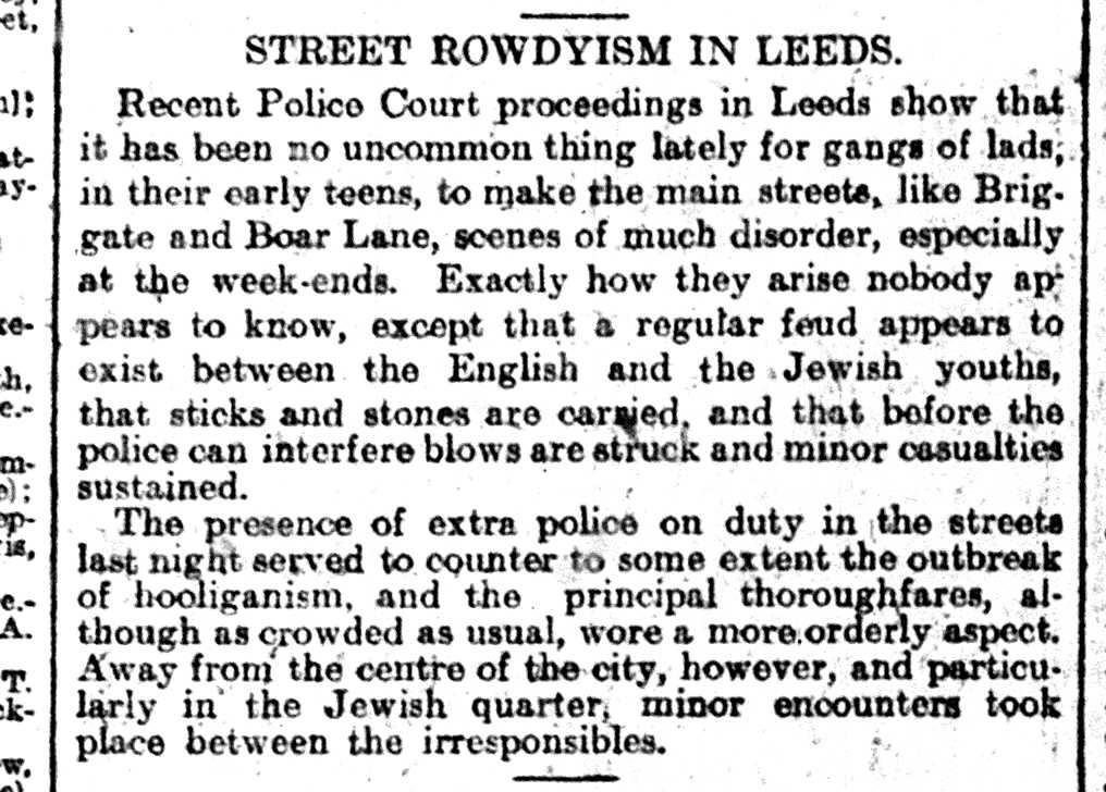 So, Leeds on that weekend of June 3, 1917: in short, a mixture of the historically-memorable and the mundane. As well as the Peace Convention, Leeds – perhaps not coincidentally, in the tumult of War and its attendant social upheaval – saw a series of violent clashes between English and Jewish youths: