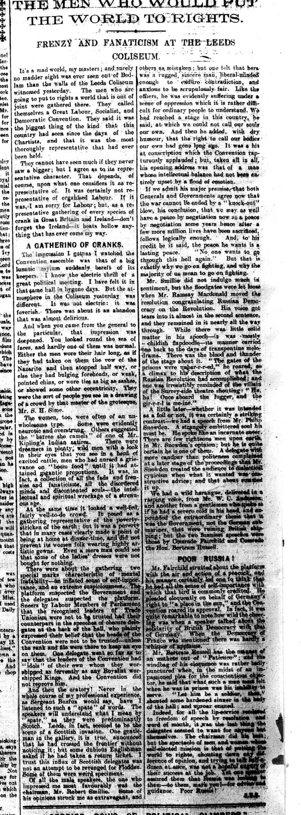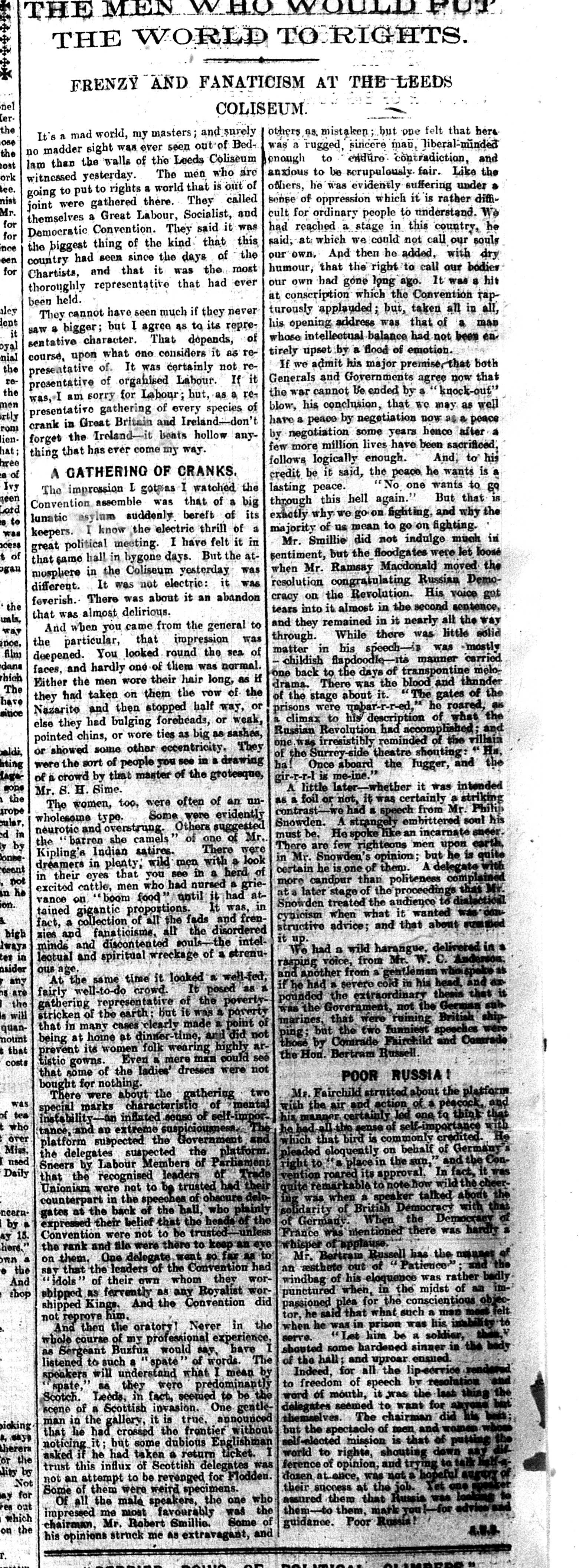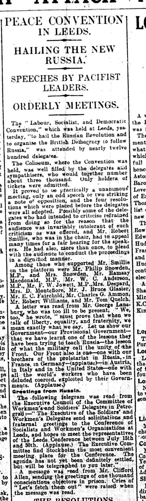 Tomorrow will mark a century since a nationally significant, but oddly little-known, event in the history of Leeds: the 1917 Peace Convention at the Coliseum. This “saw 3,500 people from across Britain gather at the Leeds Coliseum (now the O2 Academy) in solidarity with the February Revolution which had overthrown the brutal Tsarist autocracy in Russia. The Convention voted to hail the inspiration of the Russian Revolution, defend civil liberties, call for an end to the First World War and vote to set up Workers’ and Soldiers’ Councils in Britain in solidarity with the Soviets being formed in revolutionary Russia.” Present on the day, among others, were Bertrand Russell, Ramsay MacDonald, Sylvia Pankhurst, Tom Mann, Philip Snowden, Charlotte Despard, Ernest Bevin, Dora Montefiore and Willie Gallacher.
