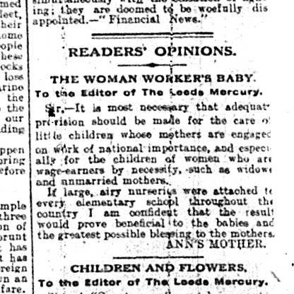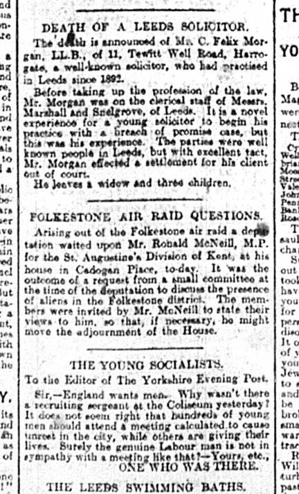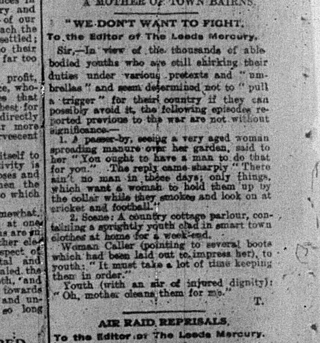 Popular entertainment can sometimes be seen as a kind of willful ignorance of what’s truly important; and the letter at the bottom of this final extract sees our author excoriating the Peace Convention on the grounds that it was an unwarranted luxury in a time of death on an unimaginable scale – expressing, at the same time, the deep and complex links between war, class and gender. For some, however, the weekend brought a poignant finality, as the top piece in this extract shows; gone, too, another connection to the older Leeds fast disappearing in the face of an increasingly modern city: