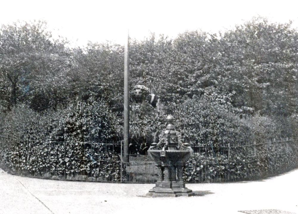 The statue was located in a rockery formed from 31 tons of iron slag brought from the Aireside Ironworks in Hunslet. In front of the rockery, Lee tells us (writing on 14 April 1883) there was a drinking fountain, seen below, with the rockery and the sculpture of the lion and the serpent (in its original location) in the background.