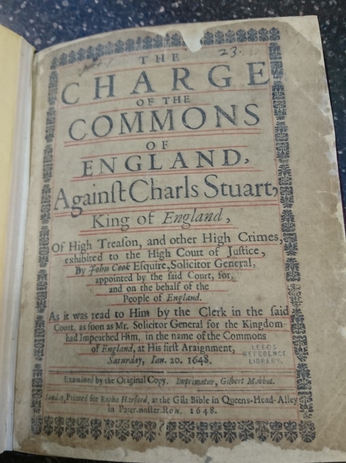 One such book, The Charge of the Commons of England Against Charles Stuart, King of England of High Treason and other High Crimes exhibited to the High Court of Justice, was issued by the Parliamentarians to justify why they had the right to execute Charles I. This primary source from the Wing Collection recalls one of the most momentous events in British History.