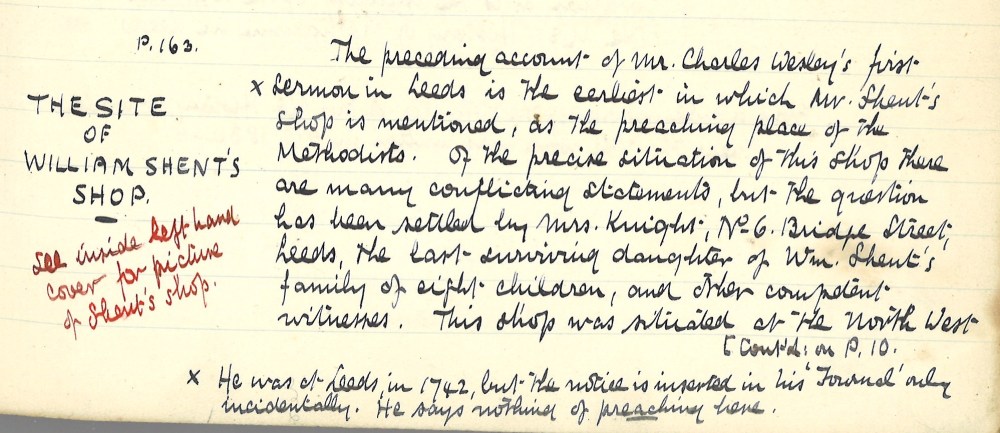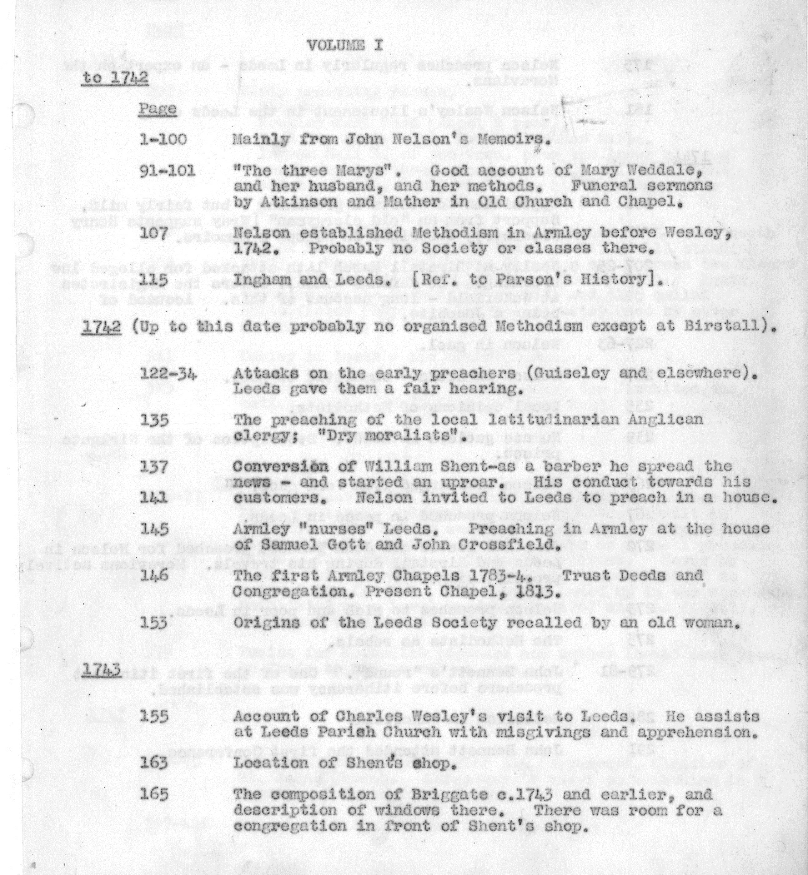 As these extracts show, Wray’s writing makes a proper reading reasonably difficult; the volumes are in need of a thorough transcribing and possibly also a proper publication (a scan of the material suggests much interpolation from other sources – including journals and memoirs – making the volumes perhaps, more accurately, Notes Towards a History of Methodism). However, in the meantime, the Central Library is also fortunate enough to hold two very useful set of notes, which together provide an index to the most interesting and historically significant passages in Methodism in Leeds.