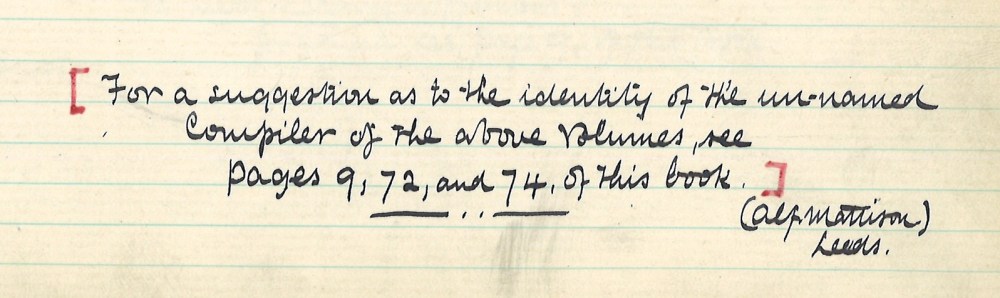 One is typewritten, with no indication of its author – but a separately-typed note does inform us that “Pencil notes” are “by F. Beckwith, Leeds Library.” F. Beckwith was Frank Beckwith, himself a noted local historian and significant figure in the development of librarianship in Leeds; being Assistant Librarian at the University of Leeds Library, where he supervised the transfer of collections to the new Brotherton Library in 1936, before becoming librarian at the Leeds Library on Commercial Street (as well as writing their definitive history).