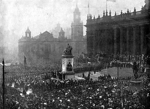 A few interesting images from our Leodis archive tell the story of her former life. In the first, a postcard view from 27 November 1905, rows of police hold back the crowds at the statue’s unveiling ceremony, presided over by the Lord Mayor, Edwin Woodhouse. The dark, many-columned building in the background is obviously the Town Hall and, if you look closely, you’ll see a brass band playing on the steps. These curved steps were removed when the statue left in 1937, making room for a carriageway and the simpler straight steps seen there today.