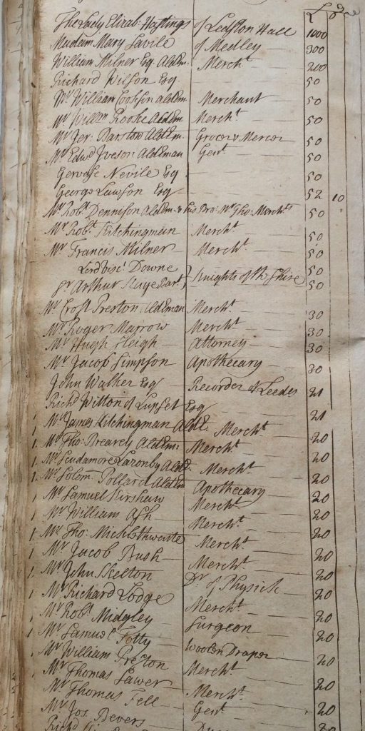 The manuscript edition of this book, held at Leeds Central Library, contains in its final pages a list of subscriptions for the erection of a new Church in Leeds [the Holy Trinity Church on Boar Lane]. This list – which is not included in the 2006 partial transcript of Lucas’ Memoranda Book – is an invaluable source of names and occupations in Leeds during the early 18th-century.