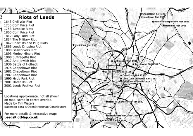 Which is where our new series comes in. While these maps can not hope to recover the actual lived experiences of protesters, their framing as a discrete set at least situates those alternative voices as an unavoidable fact in the wider story of Leeds. Indeed, we could even say: challenges to authority always imply unequal relationships with power; by making the fact of that inequality explicit, the Riot Map series works to contextualise all other approaches to Leeds history in the same light, making the disputed nature of events an obligation of any future narrative or interpretation. By literally mapping these counter-narratives onto the standard topographical model of the city, the point is made double: history – and the cartography that underpins many of those stories – is entirely a matter of contested meanings.