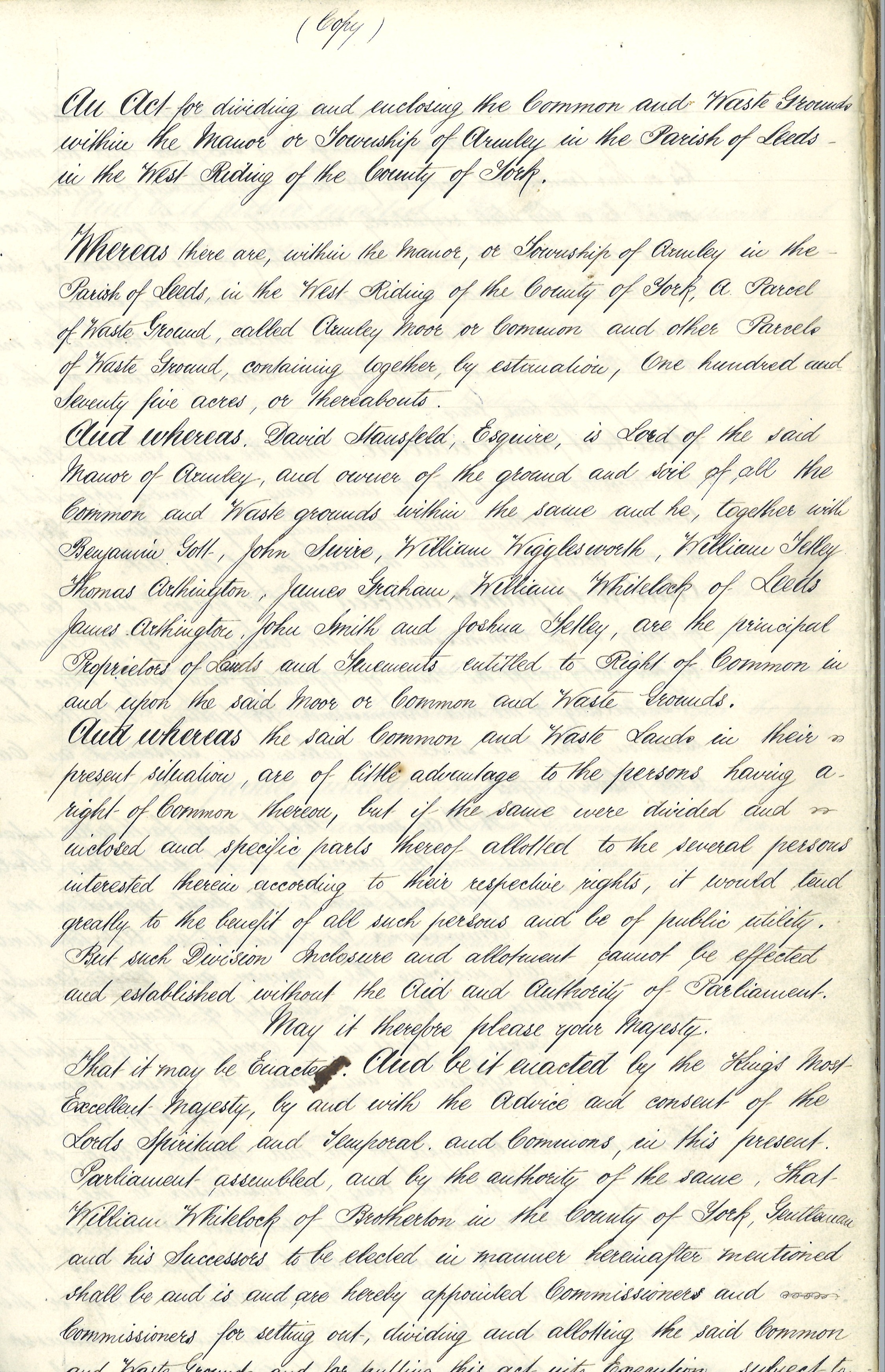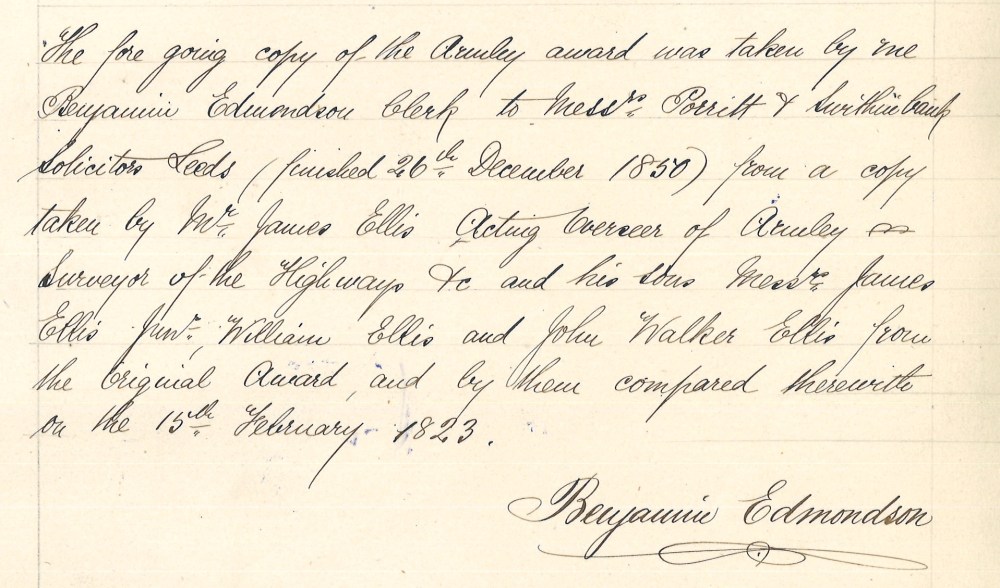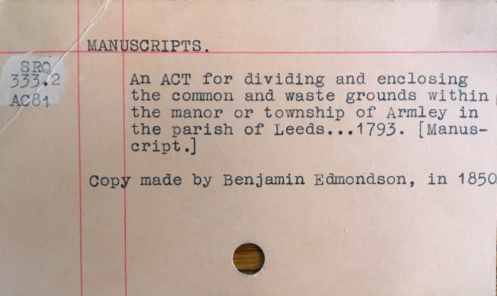 Described as being a ‘copy made by Benjamin Edmondson, in 1850,’ this manuscript is evidently part of a wider series of Acts made in the late-18th-century and which were designed to “empower enclosure of open fields and common land in England and Wales, creating legal property rights to land that was previously held in common.” Some historical context for the document is given in a Leeds City Council Conservation Area Appraisal document for Armley, while you can find more general information about researching Enclosure Awards on the National Archives website.