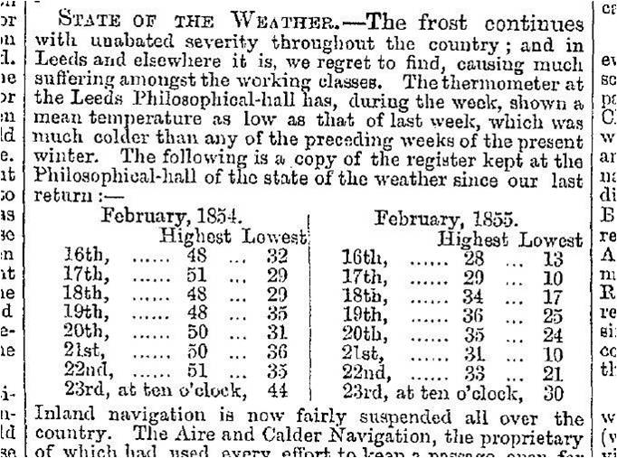 Whatever the attraction of playing cricket on ice, Leeds has a long tradition of big-freeze sporting events. (In fact, the city’s earliest recorded football match took place on the frozen river in 1715.) But plummeting temperatures typically brought more hardship than fun. The 1855 report continues: “Many of the public lamps in the outskirts of town have been useless for more than a week, owing to the intensity of the frost; whilst whole streets have been destitute of water, in consequence of the freezing of the pipes and taps. Altogether the present winter, for severity and long continuance of the frost, has not been equalled for many years.”