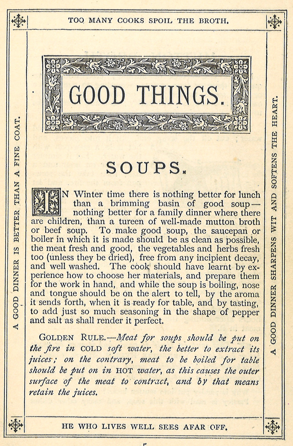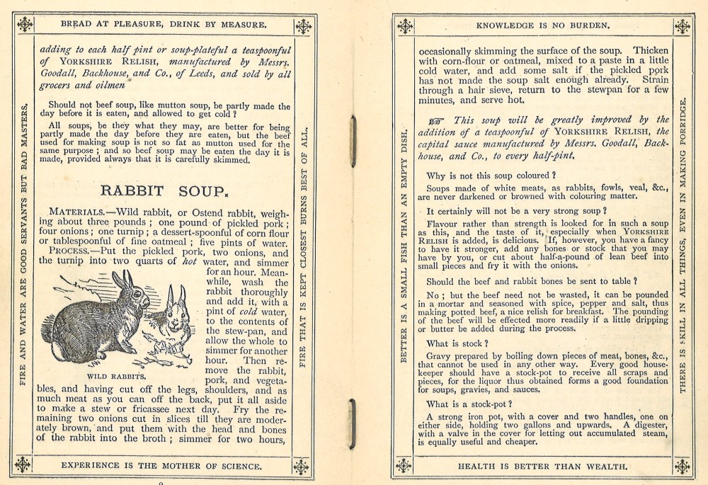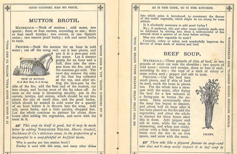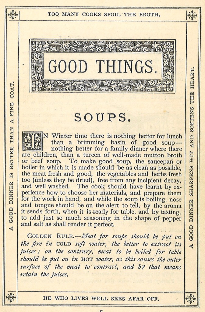 Speaking of soup, I’ll leave you with some advice and a couple of recipes from Good Things Made, Said and Done, published in Leeds by Goodall, Backhouse & Co. in 1893 (shelf mark L 641.5 GOO). Have a great Christmas – and keep warm!