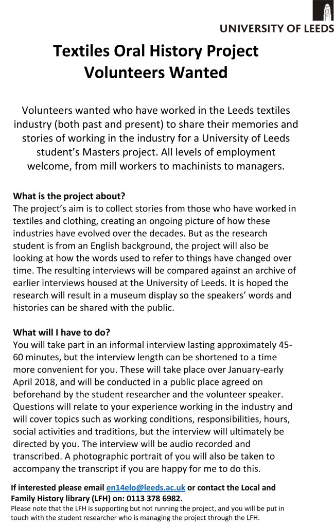 Over the next few months, I hope to discover new stories and memories like these from former and current textile workers, to create a picture of how the textile industry in West Yorkshire has changed over time. To do so, I need to find volunteer speakers.