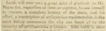 By not acknowledging that “hidden text”, Boyne’s History is, at its very root, built on the exclusion, the active exploitation, of absent voices – and not just that history itself, but all other histories derived, at least in part, from that collection. The historiography of Leeds is defined, in this reading, by its negative spaces: what is not there, what is absent – consequently, can we really now see this as the “fitting monument” Symington thought it was, without those voices being present in its narrative and those negative spaces being positively filled?