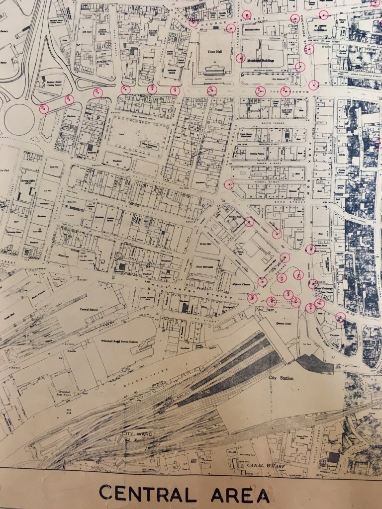 What did not make it into that folder, but which attracted plenty of attention at Jessica’s workshop (and then again at another workshop looking at the history and legacy of the textile industry, led by Emily Owen, once more at the Central Library) was a map of Leeds city centre from 1967. The map’s identifying label indicates that it was created by the City Council’s Highway Department – but with no suggestion as to what purpose it was made. But that does not really matter, at least not for our workshop, or this blog. Because what is of interest is the level of detail seen on the map, and the extent of the area it covers.