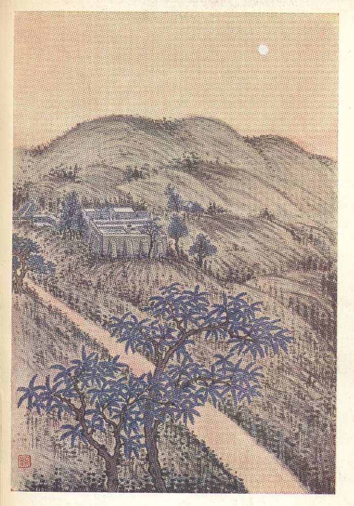 Chiang also painted Parcevall Hall with this vision in mind, in a style more reminiscent of the Ming dynasty paintings of Wang Jian (1598-1677), than the traditional watercolour landscapes we are more accustomed to seeing of Yorkshire. In the painting, he depicts both the purple sky and foliage that awed him when he first arrived, as well as the moon that brought him the joy that inspired the poem.