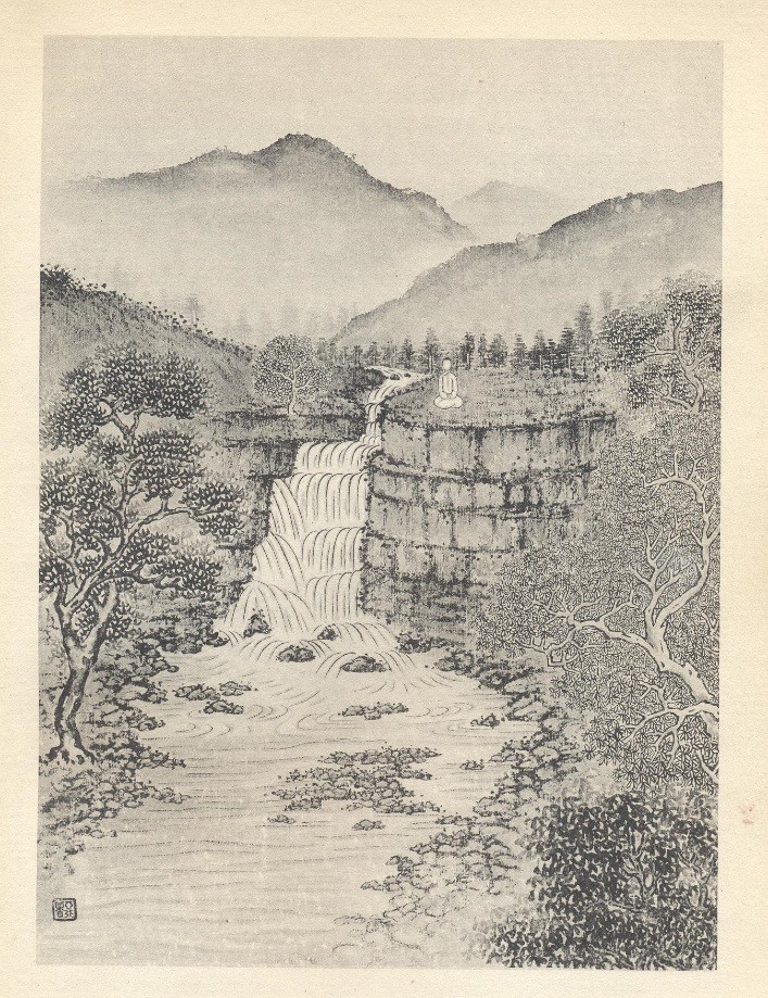His imagination drifted off, and he saw the scene as if it were and old Chinese painting. As he looked out, he told himself that someday he must go up beside the waterfall and sit in meditation on a prominent rock beside the river. He went on to paint this imagined scene in a style reminiscent of old Ch’an (Zen) landscape paintings. The figure of himself is painted with as few lines as possible, and dwarfed by the immense landscape. He blends in to the landscape and becomes part of it, rather than the focus of the painting’s attention.