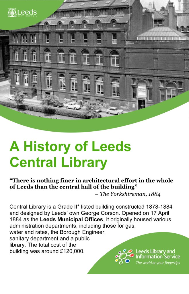 This last Wednesday, to mark National Libraries Week, four of our Local and Family History team, plus one intrepid volunteer, delivered a talk offering a brief history of Leeds Central Library, primarily derived from material found in several volumes of news-cuttings covering public libraries in Leeds. So, this week on the Secret Library we offer a few highlights and extracts from that talk. You can read more about the history of the Central Library by clicking on the image below.