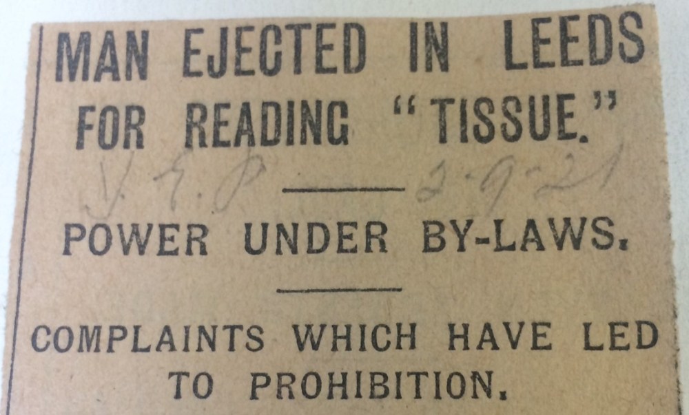 Obviously WWI dominates a lot of the newscuttings in this period and Thomas Hand, the City Librarian, gives regular updates on the use and users of Central Library. He explains to the Yorkshire Evening Post in 1915 that the nature of library users had changed since the war began. Many of the young men who were issued library tickets were serving overseas and their wives, sisters and mothers had started visiting and using their tickets instead. The types of library books borrowed also changed throughout the war. There was a heavy fall in demand for works of art and science and a large increase in demand for books on those countries engaged in the war, their economic conditions, topography, as well as books on sociology and geography. In the following years there was greater demand for books on European politics, navy equipment, engineering and munitions but fiction loans remained high. Post 1918, books concerning the war fell out of favour with all but demobilised soldiers who wanted to read what was written about the events they took part in.