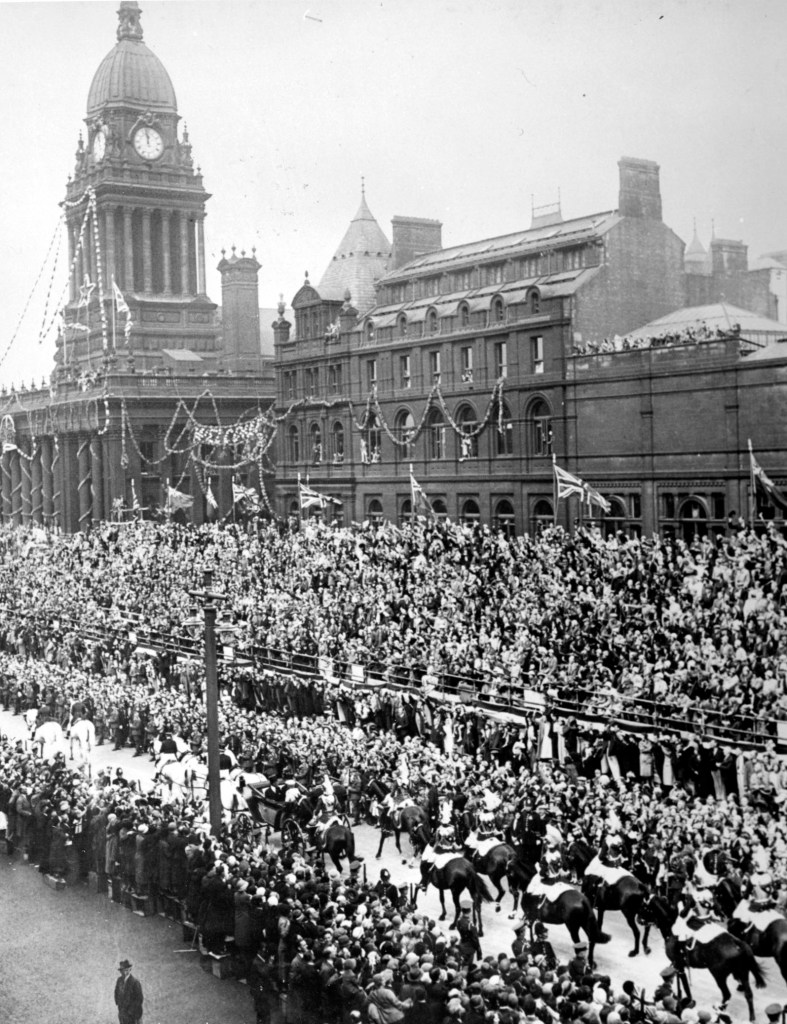 To briefly summarise other interesting points from the inter-war years; puzzles and radio were blamed for a decrease in the use of Library books, we received a donation of £100 from Mrs Councillor Gott in October 1930 to purchase books on English Gardening for the Reference Library and Alf Mattison gave us a talk on old Leeds in 1931. In 1933 the Police moved into Central Library they were here until the mid-1960s and for some reason aren’t mentioned in the any of the news cuttings but if you look around the building now there are remnants of the Police being here with CID signs still on the ground floor in the atrium and on the 1st floor corridor. You can see plenty of photographs of the various police offices on Leodis. Finally in 1933 the Civic Hall opened and Leeds welcomed a visit from King George V and Queen Mary, here is a fantastic photograph of the Royal Procession passing the Municipal Buildings on 23rd August 1933. – Sally Hughes (Librarian, Local and Family History, Central Library)