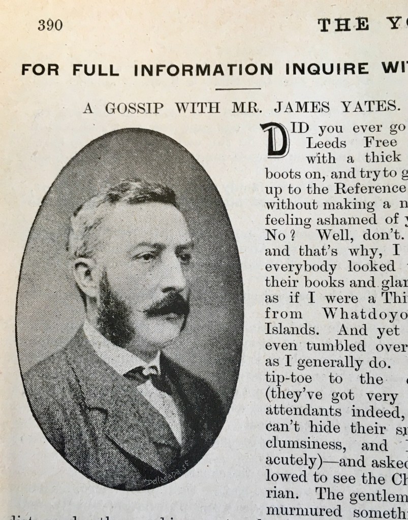 So it was that the various Library departments – the Reading Room (for newspapers and journals), the Lending Library and the Reference Library found themselves occupying the ground (now Tiled Hall cafe), 1st and 2nd Floors, respectively, of the new Municipal Building’s southern side, following its official opening in 1884. Overseeing all of these developments was the first Chief Librarian of Leeds – James Yates.