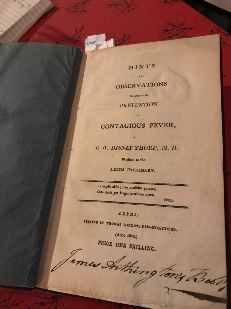 Making new connections that night were Sally with the Hints and Observations Relative to the Prevention of Contagious Fever, By R.W. Disney Thorpe, M.D. Physician to the Leeds Infirmary (Anno.1902). A small pamphlet of recommendations with the aim of establishing a ‘House of Recovery’ for people suffering from Contagious Fever (Small Pox) in Leeds in the late 1700s/early 1800s when poverty and unsanitary living conditions meant disease spread rapidly through communities. While houses of recovery were proven to help reduce the number of fatalities from small pox, other suggestions leave a lot to be desired including the placing of the patient in the street while 4 gallons of freezing water is dumped over them.